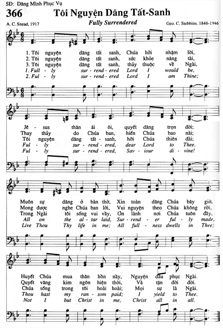 1. Tôi nguyện dâng tất sanh, Chúa hỡi nhậm lời, Muôn sự dâng ở bàn thờ, Xin toàn dâng Chúa bây giờ, Huyết Chúa mua thân hồn này, Nguyện đâu phục Ngài. 2. Tôi nguyện dâng tất sanh, Sức khỏe năng tài, Mong được nghe Chúa ban lời, Vui nguyện theo Chúa không rời, Quyết vâng kim ngôn hiện thời, Và tận đời đời. 3. Tôi nguyện dâng tất sanh, thảy thuộc về Ngài, Trong Ngài tôi sống vui vầy, Ơn lành nơi Chúa tuôn đầy, Chúa sống trong tôi hoài hoài; Mọi sự là Ngài.