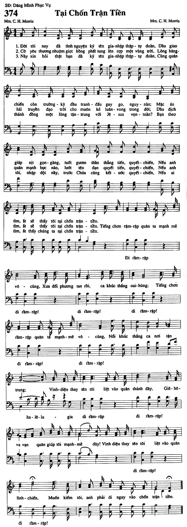 1. Đời tôi nay đà tình nguyện ký tên gia nhập thập - tự đoàn, Dầu giao chiến còn trường - kỳ đầu tranh đấu gay go, nguy nàn; Mặc áo giáp nịt gọn gàng, tuốt gươm thần thẳng tiến, quyết - chiến, Nếu anh tìm, ắt sẽ thấy tôi tại chốn trận tiền. 2. Cờ yêu thương nhuộm giọt hồng phất tung lên rợp một vùng trời, Lòng hăng - hái truyền đạo trời cho muôn kẻ luân - vong trong đời; Dầu địch quân mạnh bực nào, lướt tên đạn quyết tiến, quyết chiến, Nếu anh tìm, ắt sẽ thấy tôi tại chốn trận tiền. Tiếng chơn rậm-rập quân ta mạnh mẽ vô cùng, Xưa đối phương tan rồi, ca khúc thắng oai hùng; Tiếng chơn rầm - rập quân ta mạnh mẽ vô cùng, Nổi khúc thắng ca nơi tận trung: Vinh - diệu thay tên tôi liệt vào quân thánh đây, Giê - hô - va vạn quân giúp tôi mạnh - mẽ đây! Vinh diệu thay tên tôi liệt vào quân lính - chiến, Muốn kiếm tôi, anh phải đi ngay vào chốn trận tiền. 3. Này xin hỏi thật bạn đà ký tên gia nhập thập - tự đoàn, Cùng quân thánh đồng một lòng tận - trung với Jê - sus vẹn - toàn? Bạn theo tôi, nhập đội này, trước Chúa cùng kết ước quyết - chiến, Nếu ai tìm, ắt thấy chúng ta tại chốn trận tiền. Điệp khúc: Đi rầm - rập! đi rầm - rập! đi rầm - rập! đi rầm - rập! ha - lê - lu gia đi rầm - rập đi rầm - rập! đi rầm - rập!