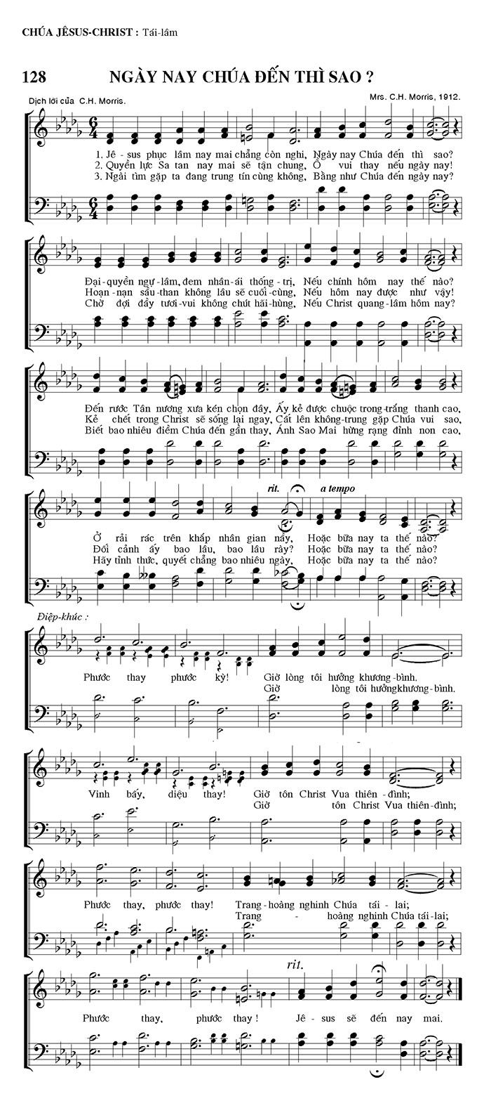1. Jê - sus phục lâm nay mai chẳng còn nghi, Ngày nay Chúa đến thì sao? Đại - quyền ngự - lâm, đem nhân ái thống trị, Nếu chính hôm nay thế nào? Đến rước Tân nương xưa kén chọn đây, Hoặc bữa nay ta thế nào? 2. Quyền lực Sa tan nay mai sẽ tận chung, O vui thay nếu ngày nay! Hoạn nạn sầu than không lâu sẽ cuối cùng, Nếu hôm nay được như vậy! Kẻ chết trong Christ sẽ sống lại ngay, Hoặc bữa nay ta thế nào? 3. Ngài tìm gặp ta đang trung tín cùng không, Bằng như Chúa đến ngày nay? Chờ đợi đầy tươi vui không chút hãi hùng, Nếu Christ quang - lâm hôm nay? Biết bao nhiêu điểm Chúa đến gần thay, Hoặc bữa nay ta thế nào? Điệp khúc: Ở rải rác trên khắp nhân gian nấy, Hoặc bữa nay ta thế nào? Đối cảnh ấy bao lâu, bao lâu rày? Hoặc bữa nay ta thế nào? Hãy tỉnh thức, quyết chẳng bao nhiêu ngày, Hoặc bữa nay ta thế nào? Phước thay phước kỳ! Giờ lòng tôi hưởng khương -bình. Vinh bấy, diệu thay! Giờ tôn Christ Vua thiên - đình; Phước thay, phước thay! Trang - hoàng nghinh Chúa tái - lai; Phước thay, phước thay! Jê - sus sẽ đến nay mai.