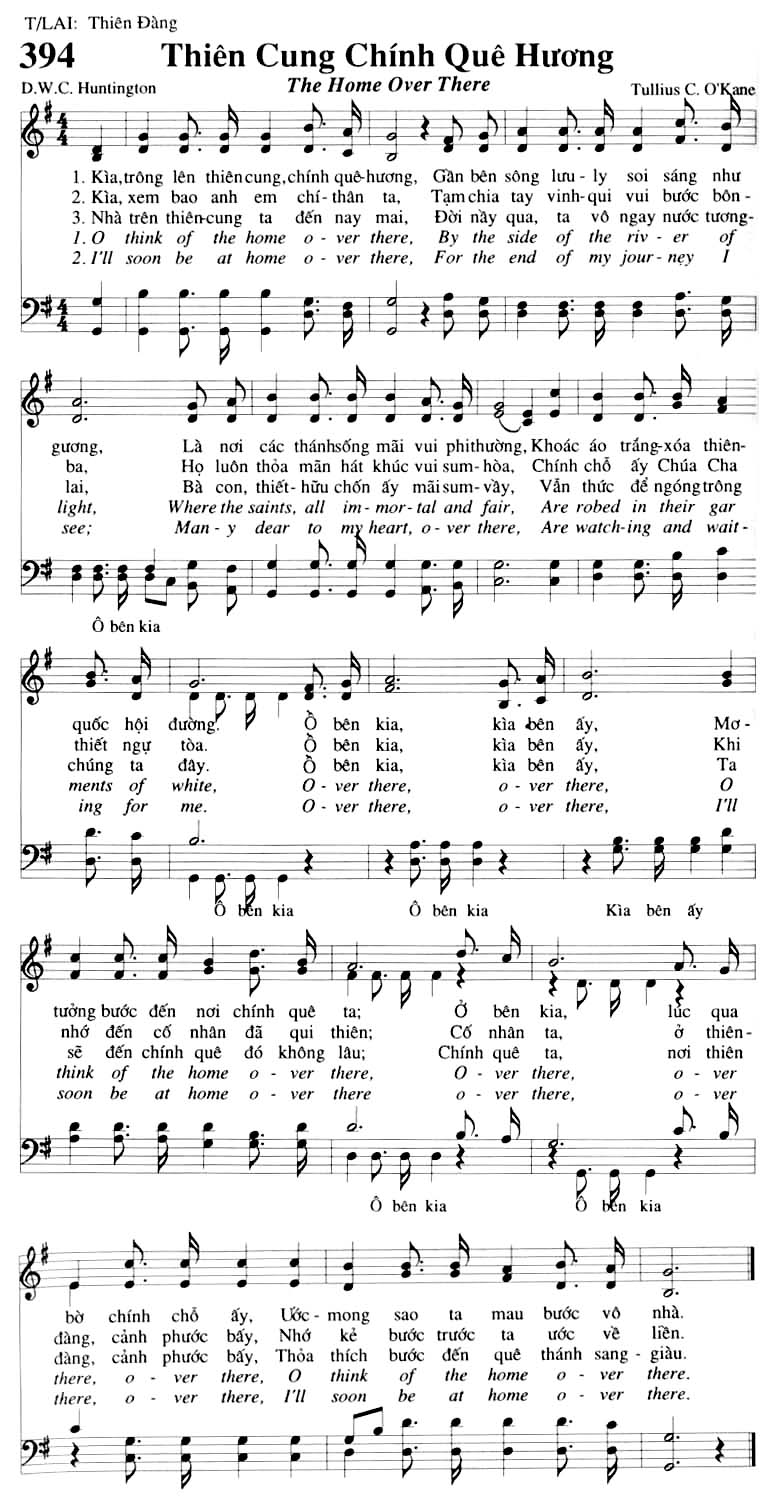 1. Kìa, trông lên thiên cung, chính quê hương, Gần bên sông lưu ly soi sáng như gương, Là nơi các thánh sống mãi vui phi thường, Khoác áo trắng xóa thiên quốc hội đường. Ô bên kia, kìa bên ấy, tưởng bước đến nơi chính quê ta; Ở bên kia, lúc qua bờ chính chỗ ấy, Ước mong sao ta mau bước vô nhà. O think of the home o-ver there, By the side of the river of light, Where the saints, all im-mor-tal and fair, Are robed in their garments of white, O-ver there, o-ver there, O think of the home o-ver there, there, o-ver there, O think of the home o-ver there. 2. Kìa, xem bao anh em chí-thân ta, Tạm chia tay vinh-qui vui bước bôn ba, Họ luôn thỏa mãn hát khúc vui sum-hòa, Chính chỗ ấy Chúa Cha thiết ngự tòa. Ô bên kia, kìa bên ấy, nhớ đến cố nhân đã qui thiên; Cố nhân ta, ở thiên đàng, cảnh phước bấy, Nhớ kẻ bước trước ta ước về liền. I'll soon be at home o-ver there, For the end of my jour-ney I see; Many dear to my heart, o-ver there, Are watch-ing and wait-ing for me. O-ver there, o-ver there, I'll soon be at home o-ver there, there, o-ver there, I'll soon be at home o-ver there. 3. Nhà trên thiên cung ta đến nay mai, Đời nầy qua, ta vô ngay nước tương lai, Bà con, thiết-hữu chốn ấy mãi sum-vầy, Vẫn thức để ngóng trông chúng ta đây. Ô bên kia, kìa bên ấy, sẽ đến chính quê đó không lâu; Chính quê ta, nơi thiên đàng, cảnh phước bấy, Thỏa thích bước đến quê thánh sang giàu. Điệp khúc: Ô bên kia, Ô bên kia, Kìa bên ấy, Ô bên kia, Ô bên kia, Kìa bên ấy, Ô bên kia, Ô bên kia, Kìa bên ấy.