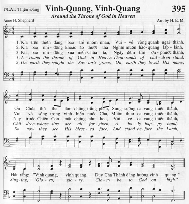 1. Kìa trên thiên đàng bao trẻ nhóm nhau, Vui vẻ vòng quanh ngai thánh, Ơn Chúa thứ tha, tâm chúng trắng phau, Sung-sướng ca vang thiên thành, 2. Kìa bao nhi đồng khoác áo thướt tha Nghìn muôn hào quang lấp lánh, Vui vẻ sống trong vinh-hiển nước Cha, Muôn thuở ca vang thiên-thành, 3. Kìa, bao nhi đồng xưa mến Chúa ta, Ngày đêm tìm ơn - phước thánh, Nay trước Chiên Con mặt chúng như hoa, Vui vẻ ca vang thiên-thành, Điệp khúc: Hát rằng: "Vinh quang, vinh quang, Duy Cha Thánh đáng hưởng vinh quang!"