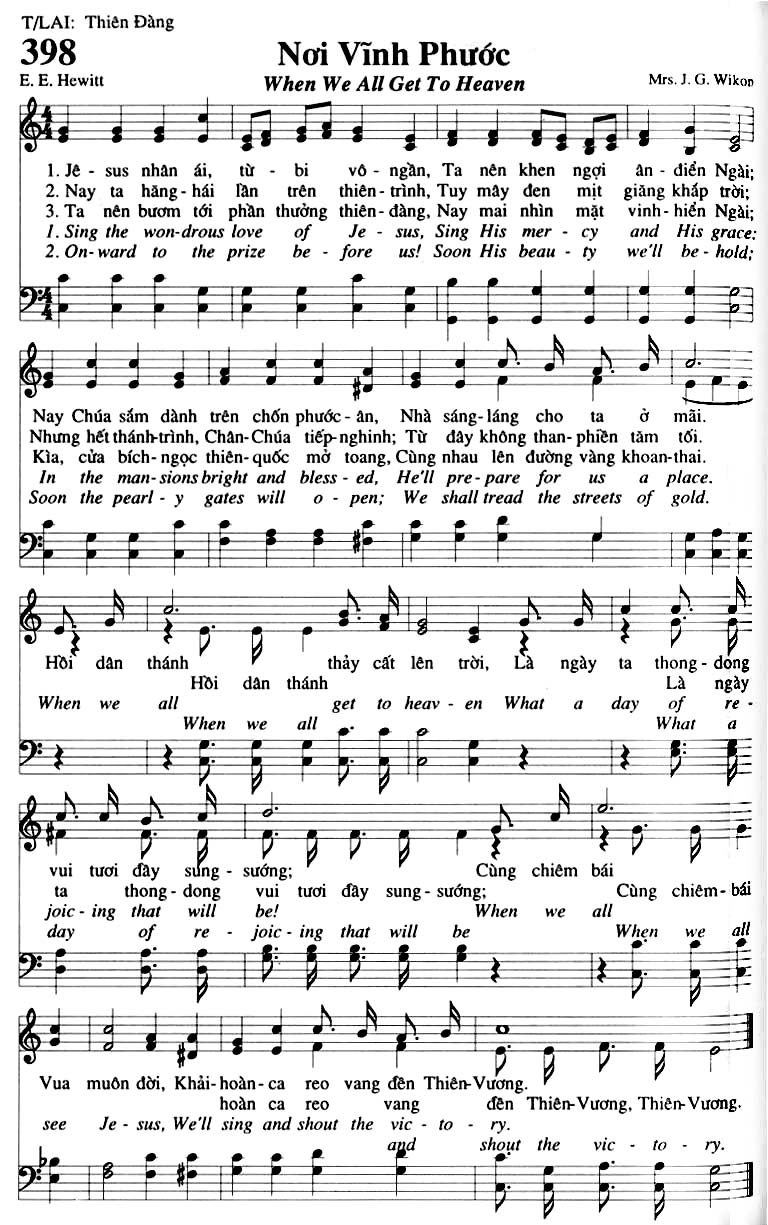 1. Jêsus nhân ái, từ bi vô ngần, Ta nên khen ngợi ân - điển Ngài; Nay Chúa sắm dành trên chốn phước - ân, Nhà sáng láng cho ta ở mãi. 2. Nay ta hăng - hái lần trên thiên - trình, Tuy mây đen mịt giăng khắp trời; Nhưng hết thánh trình, Chân-Chúa tiếp-nghinh; Từ đây không than phiền tăm tối. 3. Ta nên bươm tới phần thưởng thiên - đàng, Nay mai nhìn mặt vinh - hiển Ngài; Kìa, cửa bích - ngọc thiên-quốc mở toang, Cùng nhau lên đường vàng khoan-thai. Điệp khúc: Hồi dân thánh thảy cất lên trời, Là ngày ta thong - dong vui tươi đây sung - sướng; Hồi dân thánh thảy cất lên trời, Là ngày ta thong - dong vui tươi đây sung - sướng; Cùng chiêm bái Vua muôn đời, Khải-hoàn-ca reo vang đền Thiên-Vương. Cùng chiêm bái Vua muôn đời, Khải-hoàn-ca reo vang đền Thiên-Vương, Thiên-Vương.