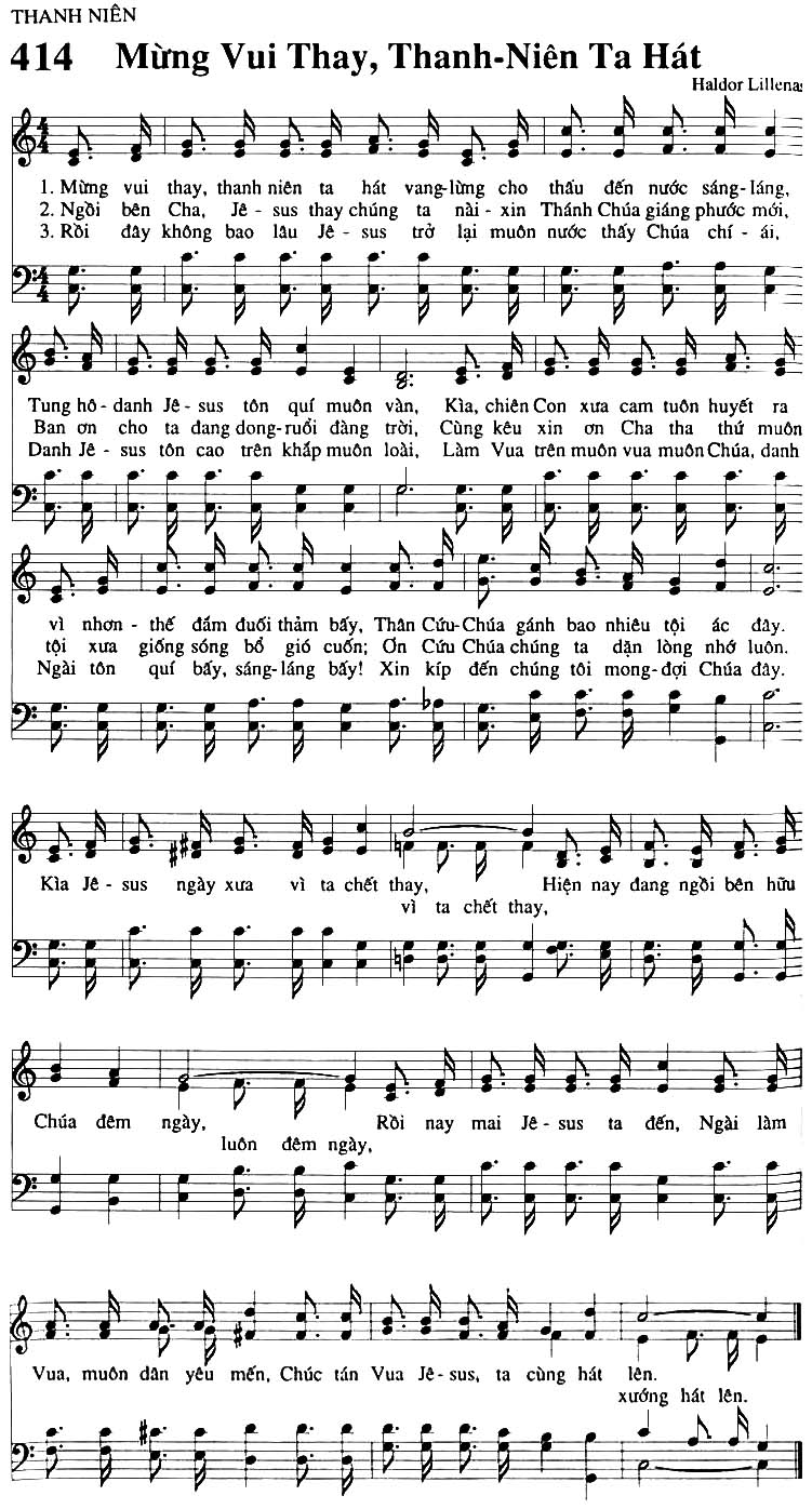 1. Mừng vui thay, thanh niên ta hát vang lừng cho thấu đến nước sáng-láng, Tung hô - danh Jêsus tôn quí muôn vàn, vì nhơn - thế đắm đuối thảm bấy, Thân Cứu-Chúa gánh bao nhiêu tội ác đây. Kìa Jê-sus ngày xưa vì ta chết thay, Hiện nay đang ngồi bên hữu Chúa đêm ngày, Vua, muôn dân yêu mến, Chúc tán Vua Jê-sus, ta cùng hát lên. 2. Ngồi bên Cha, Jêsus thay chúng ta nài - xin Thánh Chúa giáng phước mới, Ban ơn cho ta dang dong-ruổi đàng trời, tội xưa giống sóng bổ gió cuốn; Ơn Cứu Chúa chúng ta dặn lòng nhớ luôn. Kìa Jê-sus ngày xưa vì ta chết thay, Hiện nay đang ngồi bên hữu Chúa đêm ngày, Vua, muôn dân yêu mến, Chúc tán Vua Jê-sus, ta cùng hát lên. 3. Rồi đây không bao lâu Jêsus trở lại muôn nước thấy Chúa chí - ái, Danh Jêsus tôn cao trên khắp muôn loài, Ngài tôn quí bấy, sáng-láng bấy! Xin kíp đến chúng tôi mong-đợi Chúa đây. Kìa Jê-sus ngày xưa vì ta chết thay, Hiện nay đang ngồi bên hữu Chúa đêm ngày, Vua, muôn dân yêu mến, Chúc tán Vua Jê-sus, ta cùng hát lên. Điệp khúc: Kìa, chiên Con xưa cam tuôn huyết ra Cùng kêu xin ơn Cha tha thứ muôn Làm Vua trên muôn vua muôn Chúa, danh luôn đêm ngày, Rồi nay mai Jêsus ta đến, Ngài làm xướng hát lên.