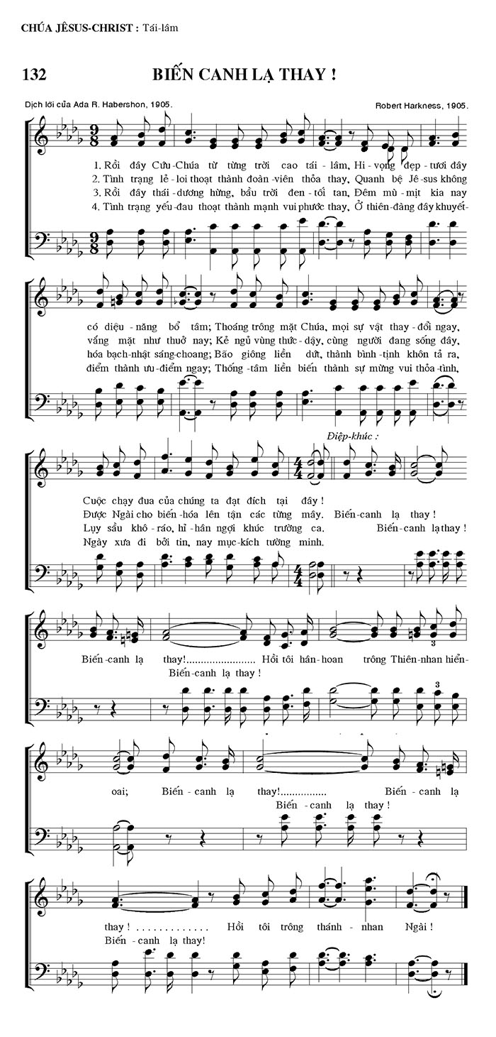 1. Rồi đây Cứu-Chúa từ từng trời cao tái-lâm, Hi vọng đẹp-tươi đây có diệu-năng bổ tâm; Thoáng trông mặt Chúa, mọi sự vật thay-đổi ngay, Biến-canh lạ thay! Hồi tôi hân-hoan trông Thiên-nhan hiển-oai; 2. Tình trạng lẻ-loi thoạt thành đoàn-viên thỏa thay, Quanh bệ Jê-sus không vắng mặt như thuở nay; Kẻ ngủ vùng thức-dậy, cùng người đang sống đây, Biến-canh lạ thay! Hồi tôi hân-hoan trông Thiên-nhan hiển-oai; 3. Rồi đây thái-dương hừng, bầu trời đen-tối tan, Đêm mù-mịt kia nay hóa bạch nhật sáng choang; Bão giông liền dứt, thành bình-tịnh khôn tả ra, Biến-canh lạ thay! Hồi tôi hân-hoan trông Thiên-nhan hiển-oai; 4. Tình trạng yếu-đau thoạt thành mạnh vui phước thay, Ở thiên đàng đây khuyết-điểm thành ưu-điểm ngay; Thống-tâm liền biến thành sự mừng vui thỏa tình, Biến-canh lạ thay! Hồi tôi hân-hoan trông Thiên-nhan hiển-oai; Điệp khúc: Cuộc chạy đua của chúng ta đạt đích tại đây! Được Ngài cho biến hóa lên tận các từng mây. Biến-canh lạ thay! Lụy sầu khô-ráo, hỉ-hân ngợi khúc trường ca. Biến-canh lạ thay! Ngày xưa đi bởi tin, nay mục-kích tường minh. Biến-canh lạ thay! Hồi tôi trông thánh nhan Ngài!