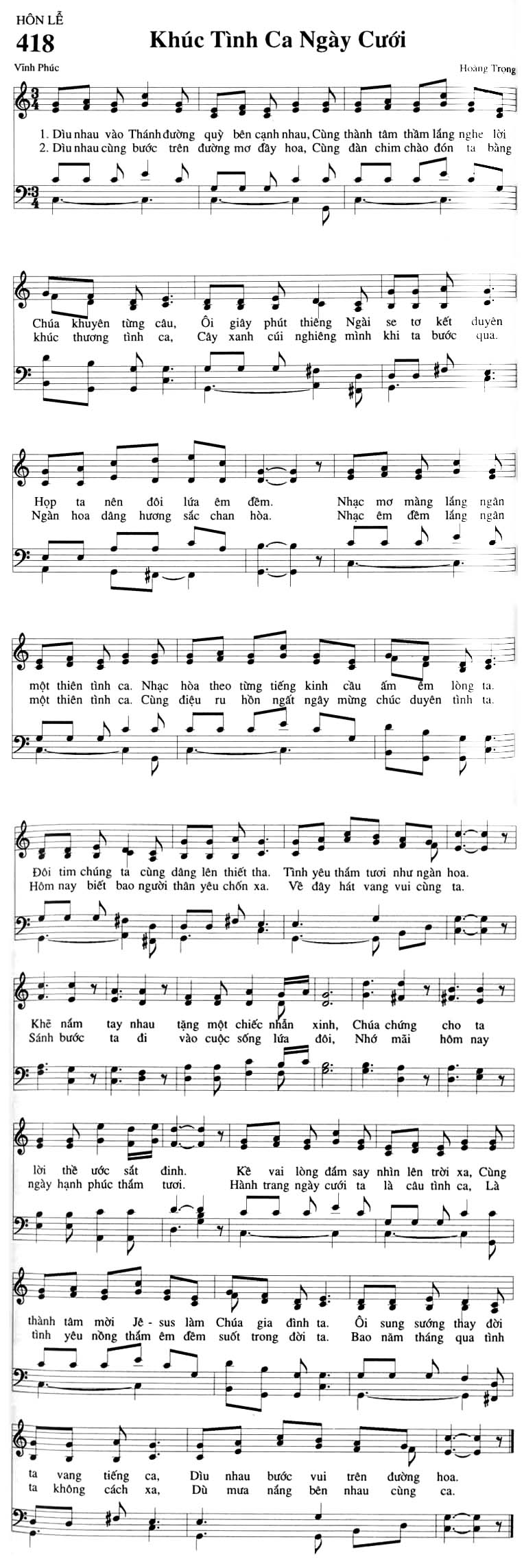 1. Dìu nhau vào Thánh đường quỳ bên cạnh nhau, Cùng thành tâm thầm lắng nghe lời Chúa khuyên từng câu, Ôi giây phút thiêng Ngài se tơ kết duyên. Hợp ta nên đôi lứa êm đềm. Nhạc mơ màng lắng ngân một thiên tình ca. Nhạc hòa theo từng tiếng kinh cầu ấm êm lòng ta. Đôi tim chúng ta cùng dâng lên thiết tha. Tình yêu thắm tươi như ngàn hoa. Khẽ nắm tay nhau tặng một chiếc nhẫn xinh, Chúa chứng cho ta lời thề ước sắt đinh. Kề vai lòng đắm say nhìn lên trời xa, Cùng thành tâm mời Jêsus làm Chúa gia đình ta. Ôi sung sướng thay đời ta vang tiếng ca, Dìu nhau bước vui trên đường hoa. 2. Dìu nhau cùng bước trên đường mơ đầy hoa, Cùng đàn chim chào đón ta bằng khúc thương tình ca, Cây xanh cúi nghiêng mình khi ta bước qua. Ngàn hoa dâng hương sắc chan hòa. Nhạc êm đềm lắng ngân một thiên tình ca. Cùng điệu ru hồn ngất ngây mừng chúc duyên tình ta. Hôm nay biết bao người thân yêu chốn xa. Về đây hát vang vui cùng ta. Sánh bước ta đi vào cuộc sống lứa đôi, Nhớ mãi hôm nay ngày hạnh phúc thắm tươi. Hành trang ngày cưới ta là câu tình ca, Là tình yêu nồng thấm êm đềm suốt trong đời ta. Bao năm tháng qua tình ta không cách xa, Dù mưa nắng bên nhau cùng ca.