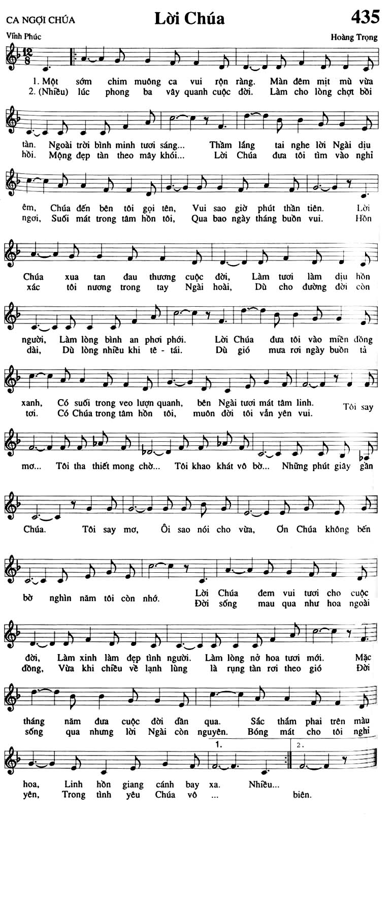1. Một sớm chim muông ca vui rộn ràng. Màn đêm mịt mù vừa tàn. Ngoài trời bình minh tươi sáng... Thầm lắng tai nghe lời Ngài dịu êm, Chúa đến bên tôi gọi tên, Vui sao giờ phút thần tiên. Lời Chúa xua tan đau thương cuộc đời, Làm tươi làm dịu hồn người, Làm lòng bình an phơi phới. Lời Chúa đưa tôi vào miền đồng xanh, Có suối trong veo lượn quanh, bên Ngài tươi mát tâm linh. Tôi say mơ... Tôi tha thiết mong chờ... Tôi khao khát vô bờ... Những phút giây gần Chúa. Tôi say mơ, Ôi sao nói cho vừa, Ơn Chúa không bến bờ nghìn năm tôi còn nhớ. Lời Chúa đem vui tươi cho cuộc đời, Làm xinh làm đẹp tình người. Làm lòng nở hoa tươi mới. Mặc tháng năm đưa cuộc đời dần qua. Sắc thắm phai trên màu hoa, Linh hồn giang cánh bay xa. Nhiều... 2. (Nhiều) lúc phong ba vây quanh cuộc đời. Làm cho lòng chợt bồi hồi. Mộng đẹp tàn theo mây khói... Lời Chúa đưa tôi tìm vào nghi ngơi, Suối mát trong tâm hồn tôi, Qua bao ngày tháng buồn vui. Hồn tôi nương trong tay Ngài hoài, Dù cho đường đời còn dài, Dù lòng nhiều khi tê - tái. Dù gió mưa rơi ngày buồn tà tơi. Có Chúa trong tâm hồn tôi, muôn đời tôi vẫn yên vui. Tôi say mơ... Tôi tha thiết mong chờ... Tôi khao khát vô bờ... Những phút giây gần Chúa. Tôi say mơ, Ôi sao nói cho vừa, Ơn Chúa không bến bờ nghìn năm tôi còn nhớ. Đời sống mau qua như hoa ngoài đồng, Vừa khi chiều về lạnh lùng là rụng tàn rơi theo gió Đời sống qua nhưng lời Ngài còn nguyên. Bóng mát cho tôi nghỉ yên, Trong tình yêu Chúa vô biên.