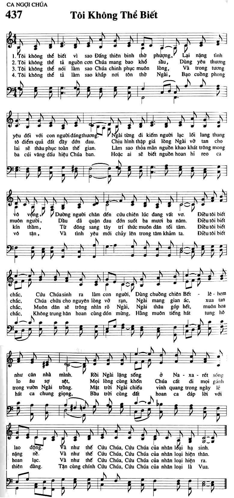 1. Tôi không thể biết vì sao Đấng thiên bình thờ phượng, Lại nặng tình yêu đối với con người đáng thương. Ngài từng đi kiếm người lạc lối lang thang vô vọng, Cứu Chúa sinh ra làm con người, Dùng chuồng chiên Bết lê hem như căn nhà mình. Rồi Ngài lặng sống ở Na xa rét sống lao động. Và như thế Cứu Chúa, Cứu Chúa của nhân loại hạ sinh. 2. Tôi không thể tả nguồn cơn Chúa mang bao khó sầu, Dùng yêu thương tô điểm quả đất đầy đớn đau. Chịu hình thập giá lòng Ngài vỡ tan cho muôn người, Chúa chữa cho nguyên lòng vỡ rạn, Ngài mang gian ác, xua tan lo âu sợ sệt, Mọi lòng cùng khốn Chúa cất đi mọi gánh nặng nè. Và như thế Cứu Chúa, Cứu Chúa của nhân loại hiện thân. 3. Tôi không thể nói làm sao Chúa chinh phục muôn lòng, Và trong tương lai sẽ thâu phục toàn thế gian. Làm sao thỏa mãn nguồn khao khát trông mong kín thầm, Muôn dân sẽ trông nhìn rõ Ngài, Ngài thâu góp hết, muôn hoa trong vườn Ngài trồng. Mặt trời Ngài chiếu vinh quang trong ngày lễ hoan lạc. Và như thế Cứu Chúa, Cứu Chúa của nhân loại hiện ra. 4. Tôi không thể tả làm sao khắp nơi tôn thờ Ngài, Bạo cuồng phong ba cúi vâng dấu hiệu Chúa ban. Hoặc ai sẽ biết nguồn hoan hỉ reo ca vô tận, Không trung hân hoan cùng đón mừng, Hàng muôn tiếng hát tung hô hát ca chung giọng, Bầu trời cùng đất hoan ca đáp lời với thiên đàng. Tận cùng chính Cứu Chúa, Cứu Chúa của nhân loại là Vua. Điệp khúc: Dường người chăn đến cứu chiên lúc đang vất vơ. Điều tôi biết Dầu đã quận đau đớn suốt ba mươi ba năm. Điều tôi biết Từ đông sang tây trí thức muôn dân tối tăm. Điều tôi biết Và tình yêu mới chảy lên trong tâm khảm ta. Điều tôi biết