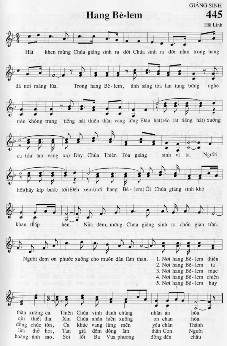 1. Hát khen mừng Chúa giáng sinh ra đời, Chúa sinh ra đời nằm trong hang đá nơi máng lừa. Trong hang Bê-lem, ánh sáng tỏa lan tưng bừng nghe trên không trung tiếng hát thiên thần vang lừng Đàn hát(réo rất tiếng hát) xướng ca (dư âm vang xa) Đây Chúa Thiên Tòa giáng sinh vì ta. Người hỡi (hãy kíp bước tới) Đến xem (nơi hang Bê-lem) Ôi Chúa giáng sinh khó khăn thấp hèn. Nửa đêm, mừng Chúa giáng sinh ra chốn gian trần. Người đem ơn phước xuống cho muôn dân lầm than. Nơi hang Bê-lem thiên thần xướng ca. Thiên Chúa vinh danh chúng nhân ản hòa. 2. Hát khen mừng Chúa giáng sinh ra đời, Chúa sinh ra đời nằm trong hang đá nơi máng lừa. Trong hang Bê-lem, ánh sáng tỏa lan tưng bừng nghe trên không trung tiếng hát thiên thần vang lừng Đàn hát(réo rất tiếng hát) xướng ca (dư âm vang xa) Đây Chúa Thiên Tòa giáng sinh vì ta. Người hỡi (hãy kíp bước tới) Đến xem (nơi hang Bê-lem) Ôi Chúa giáng sinh khó khăn thấp hèn. Nửa đêm, mừng Chúa giáng sinh ra chốn gian trần. Người đem ơn phước xuống cho muôn dân lầm than. Nơi hang Bê-lem ta qùi thiết tha. Xin Chúa nhân hiền xuống ơn chan hòa. 3. Hát khen mừng Chúa giáng sinh ra đời, Chúa sinh ra đời nằm trong hang đá nơi máng lừa. Trong hang Bê-lem, ánh sáng tỏa lan tưng bừng nghe trên không trung tiếng hát thiên thần vang lừng Đàn hát(réo rất tiếng hát) xướng ca (dư âm vang xa) Đây Chúa Thiên Tòa giáng sinh vì ta. Người hỡi (hãy kíp bước tới) Đến xem (nơi hang Bê-lem) Ôi Chúa giáng sinh khó khăn thấp hèn. Nửa đêm, mừng Chúa giáng sinh ra chốn gian trần. Người đem ơn phước xuống cho muôn dân lầm than. Nơi hang Bê-lem mục đồng chúc tôn, Ca khúc vang lừng mến yêu chân Thành. 4. Hát khen mừng Chúa giáng sinh ra đời, Chúa sinh ra đời nằm trong hang đá nơi máng lừa. Trong hang Bê-lem, ánh sáng tỏa lan tưng bừng nghe trên không trung tiếng hát thiên thần vang lừng Đàn hát(réo rất tiếng hát) xướng ca (dư âm vang xa) Đây Chúa Thiên Tòa giáng sinh vì ta. Người hỡi (hãy kíp bước tới) Đến xem (nơi hang Bê-lem) Ôi Chúa giáng sinh khó khăn thấp hèn. Nửa đêm, mừng Chúa giáng sinh ra chốn gian trần. Người đem ơn phước xuống cho muôn dân lầm than. Nơi hang Bê-lem chiên lừa thở hơi, Tan giá đêm đông ấm thân Con Người. 5. Hát khen mừng Chúa giáng sinh ra đời, Chúa sinh ra đời nằm trong hang đá nơi máng lừa. Trong hang Bê-lem, ánh sáng tỏa lan tưng bừng nghe trên không trung tiếng hát thiên thần vang lừng Đàn hát(réo rất tiếng hát) xướng ca (dư âm vang xa) Đây Chúa Thiên Tòa giáng sinh vì ta. Người hỡi (hãy kíp bước tới) Đến xem (nơi hang Bê-lem) Ôi Chúa giáng sinh khó khăn thấp hèn. Nửa đêm, mừng Chúa giáng sinh ra chốn gian trần. Người đem ơn phước xuống cho muôn dân lầm than. Nơi hang Bê-lem huy hoàng ánh sao, Soi lối Ba Vua phương đông đến chầu.