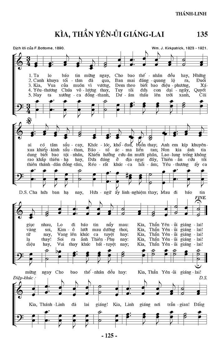 1. Ta lo báo tin mừng ngay, Cho bao thế nhân đều hay, Những ai có tâm sầu cay, Khóc lóc, khổ đau, buồn thay; Anh em kíp khuyên giục nhau, Lo đi báo tin nầy mau: Kìa, Thần Yên ủi giáng lai! 2. Canh khuya tối tăm đà qua, Ban mai đăng quang lộ ra, Đuổi xua khiếp kinh sầu than, Bão tố ác ma liền tan; Non kia ánh tia vàng soi, Kim ô lướt mau dường thoi; Kìa, Thần Yên ủi giáng lai! 3. Kia, Vua của muôn vì vương, Đem theo biết bao điệu phương, Xá dung biết bao tội nhân, Khiến hưởng cứu ân mười phân, Lao-lung trống không nay, Vang lên khúc ca tuyệt hay: Kìa, Thần Yên ủi giáng lai! 4. Yêu thương Chúa vô lượng thay, Tuy tôi đứa con dại ngây, Quyết rao khắp thiên hạ hay, Đứa đáng ở địa ngục đây, Thiên ân cứu tôi lạ thay! Soi ra ảnh Thiên Phụ nay: Kìa, Thần Yên ủi giáng lai! 5. Nay ta xướng ca đồng thanh, Dư âm thấu lên trời xanh, Cõi thiên thánh dân đồng tâm, Réo rắt khúc ca hồi âm; Yêu thương ấy ca diệu hay, Vui thay khúc bất tuyệt nay; Kìa, Thần Yên ủi giáng lai! D.S.. Cha hứa ban hạ nay, Hứa ngữ ấy linh nghiệm thay, Mau đi báo tin mừng ngay Cho bao thế nhân đều hay: Kìa, Thần Yên ủi giáng lai! Điệp khúc: Kìa, Thánh Linh đà lai giáng! Kia, Linh giáng nơi trần gian! Đấng