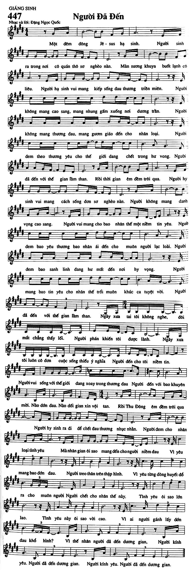 1. Một đêm đông Jesus hạ sinh. Người sinh ra trong nơi cô quán thô sơ nghèo nàn. Màn sương khuya buốt lạnh cô liêu. Người hạ sinh vui mang kiếp sống đau thương triền miên. Người không mang cao sang, mang nhung gấm xuống nơi dương trần. Người không mang thương đau, mang gươm giáo đến cho nhân loại. Người đem theo thương yêu cho thế giới đang chết trong hư vong. Người đã đến với thế gian lầm than. Rồi thời gian êm đềm trôi qua. Người hy sinh vui mang cách sống đơn sơ nghèo nàn. Người không mang danh vọng cao sang. Người vui mang cho bao nhân thế một niềm tin yêu. Người đem bao yêu thương bao nhân ái đến cho muôn người lạc loài. Người đem bao sanh linh đang hư mất đến nơi hy vọng. Người mang bao tin yêu cho nhân thế trổi muôn khúc ca tuyệt vời. 2. Người đã đến với thế gian lầm than. Ngày xưa tai tôi không nghe, đôi mắt chẳng thấy lối. Người phán khiến tôi được lành. Ngày xưa tôi luôn cô đơn cuộc sống thiếu ý nghĩa Người đến cho tôi niềm tin. Người vui sống với thế giới đang xoay trong thương đau Người đến với bao khuyên mời. Nào đớn đau. Nào dối gian xin vội tan. Rồi Thu Đông êm đềm trôi qua Người hy sinh ra đi để chết đau thương nhục nhằn. Người đem cho nhân loại tình yêu. 3. Mà nhân gian ôi sao mang đến cho người niềm đau. Vì yêu mang bao đớn đau. Người treo thân trên thập hình. Vì yêu từng dòng huyết đổ ra cho muôn người Người chết cho nhân thế này. Tình yêu ôi sao lớn lao. Tình yêu này ôi sao vời cao. Vì ai người gánh lấy đớn đau khổ hình? Vì thế nhân người đã đến dương gian, Người kính yêu. Người đã đến dương gian. Người kính yêu. Người đã đến dương gian.