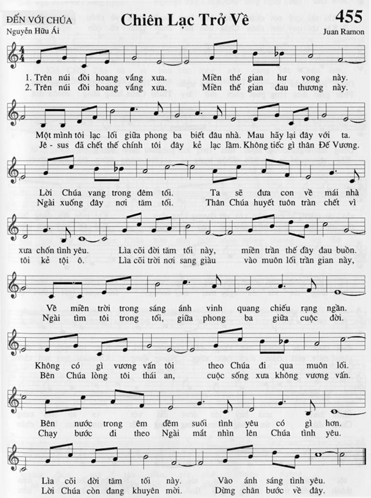 1. Trên núi đồi hoang vắng xưa. Miền thế gian hư vong này. Một mình tôi lạc lối giữa phong ba biết đâu nhà. Mau hãy lại đây với ta. Lời Chúa vang trong đêm tối. Ta sẽ đưa con về mái nhà xưa chốn tình yêu. Lìa cõi đời tăm tối này, miền trần thế đây đau buồn. Về miền trời trong sáng ánh vinh quang chiếu rạng ngần. Không có gì vương vấn tôi theo Chúa đi qua muôn lối. Bên nước trong êm đêm suối tình yêu có gì hơn. Lìa cõi đời tăm tối này. Vào ánh sáng tình yêu. 2. Trên núi đồi hoang vắng xưa. Miền thế gian đau thương này. Jêsus đã chết thế chính tôi đây kẻ lạc lầm. Không tiếc gì thân Đế Vương. Ngài xuống đây nơi tăm tối. Thân Chúa huyết tuôn tràn chết vì tôi kẻ tội ô. Lìa cõi trời nơi sang giàu vào muôn lối trần gian này, Ngài tìm tôi trong tối, giữa phong ba giữa cuộc đời. Bên Chúa lòng tôi thái an, cuộc sống xưa không vương vấn. Chạy bước đi theo Ngài mắt nhìn lên Chúa tình yêu. Lời Chúa còn đang khuyên mời. Dừng chân bước về đây.