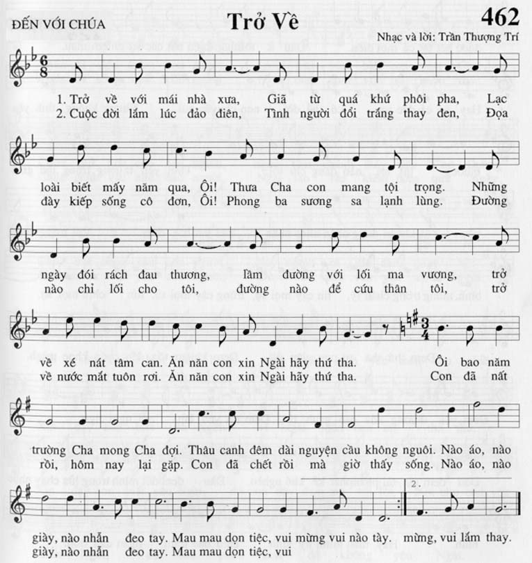 1. Trở về với mái nhà xưa, Giã từ quá khứ phôi pha, Lạc loài biết mấy năm qua, Ôi! Thưa Cha con mang tội trọng. Những ngày đói rách đau thương, làm đường với lối ma vương, trở về xé nát tâm can. Ăn năn con xin Ngài hãy thứ tha. Ôi bao năm trường Cha mong Cha đợi. Thâu canh đêm dài nguyện cầu không nguôi. Nào áo, nào giày, nào nhẫn đeo tay. Mau mau dọn tiệc, vui mừng vui nào tày. mừng, vui lắm thay. 2. Cuộc đời lắm lúc đảo điên, Tình người đổi trắng thay đen, Đọa đày kiếp sống cô đơn, Ôi! Phong ba sương sa lạnh lùng. Đường nào chỉ lối cho tôi, đường nào để cứu thân tôi, trở về nước mắt tuôn rơi. Ăn năn con xin Ngài hãy thứ tha. Con đã nất rồi, hôm nay lại gặp. Con đã chết rồi mà giờ thấy sống. Nào áo, nào giày, nào nhẫn đeo tay. Mau mau dọn tiệc, vui