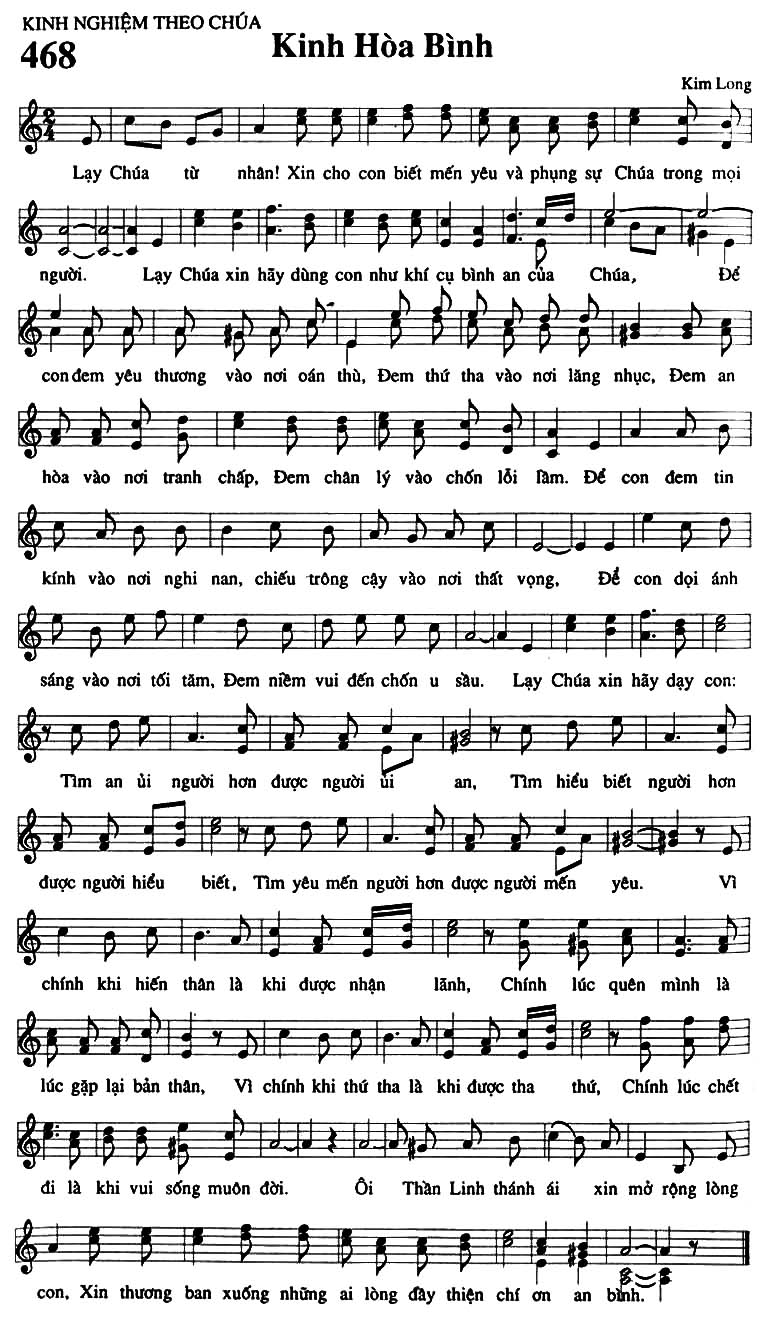 1. Lạy Chúa từ nhân! Xin cho con biết mến yêu và phụng sự Chúa trong mọi người. Lạy Chúa xin hãy dùng con như khí cụ bình an của Chúa, Để con đem yêu thương vào nơi oán thù, Đem thứ tha vào nơi lăng nhục, Đem an hòa vào nơi tranh chấp, Đem chân lý vào chốn lỗi lầm. Để con đem tin kính vào nơi nghi nan, chiếu trông cậy vào nơi thất vọng, Để con dọi ánh sáng vào nơi tối tăm, Đem niềm vui đến chốn u sầu. Lạy Chúa xin hãy dạy con: Tìm an ủi người hơn được người ủi an. Tìm hiểu biết người hơn được người hiểu biết, Tìm yêu mến người hơn được người mến yêu. Vì chính khi hiến thân là khi được nhận lãnh, Chính lúc quên mình là lúc gặp lại bản thân, Vì chính khi thứ tha là khi được tha thứ, Chính lúc chết đi là khi vui sống muôn đời. Ôi Thần Linh thánh ái xin mở rộng lòng con, Xin thương ban xuống những ai lòng đầy thiện chí ơn an bình.