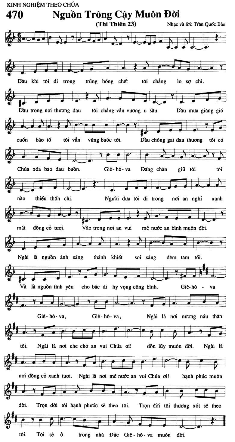 1. Dầu khi tôi đi trong trũng bóng chết tôi chẳng lo sợ chi. Dầu trong nơi thương đau tôi chẳng vẫn vương u sầu. Dầu mưa giăng gió cuốn bão tố tôi vẫn vững bước tới. Dầu chông gai đau thương tôi có Chúa xóa bao đau buồn. Giê-hô-va Đấng chăn giữ tôi tôi nào thiếu thốn chi. Người đưa tôi đi trong nơi an nghỉ xanh mát đồng cỏ tươi. Vào trong nơi an vui mé nước an bình muôn đời. Ngài là nguồn ánh sáng thánh khiết soi sáng đêm tăm tối. Và là nguồn tình yêu cho bác ái hy vọng công bình. Điệp khúc: Giê-hô-va, Giê-hô-va, Ngài là nơi nương náu thân tôi. Ngài là nơi che chở an vui Chúa ơi! đồn lũy muôn đời. Ngài là nơi đồng cỏ xanh tươi. Ngài là nơi mé nước an vui Chúa ơi! hạnh phúc muôn đời. Trọn đời tôi hạnh phước sẽ theo tôi. Trọn đời tôi thương xót sẽ theo tôi. Tôi sẽ ở trong nhà Đức Giê-hô-va muôn đời.