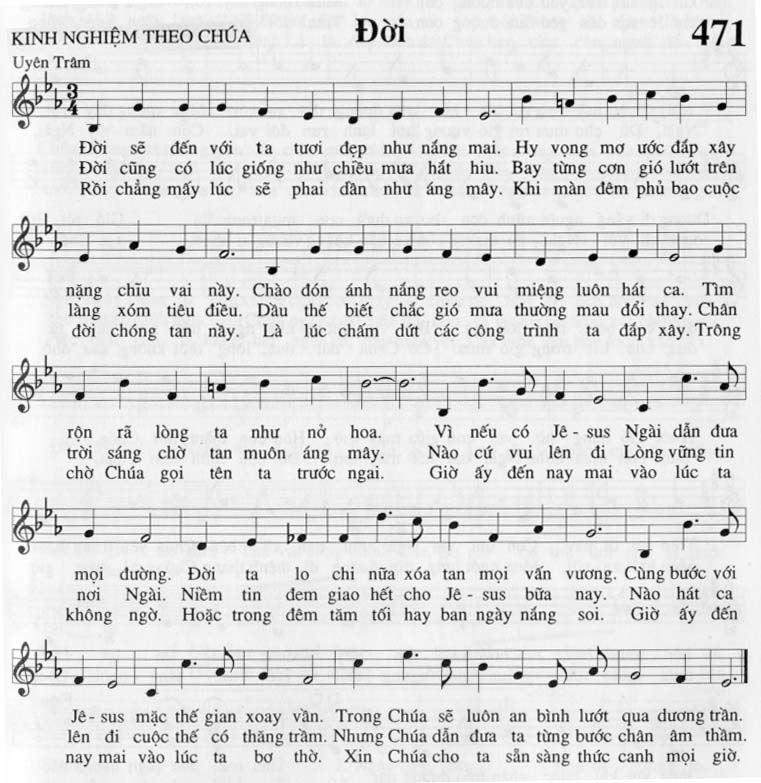 1. Đời sẽ đến với ta tươi đẹp như nắng mai. Hy vọng mơ ước đắp xây nặng chĩu vai nầy. Chào đón ánh nắng reo vui miệng luôn hát ca. Tìm rộn rã lòng ta như nở hoa. Vì nếu có Jê-sus Ngài dẫn đưa mọi đường. Đời ta lo chi nữa xóa tan mọi vấn vương. Cùng bước với Jê-sus mặc thế gian xoay vần. Trong Chúa sẽ luôn an bình lướt qua dương trần. 2. Đời cũng có lúc giống như chiều mưa hắt hiu. Bay từng cơn gió lướt trên làng xóm tiêu điều. Dầu thế biết chắc gió mưa thường mau đổi thay. Chân trời sáng chờ tan muôn áng mây. Nào cứ vui lên đi Lòng vững tin nơi Ngài. Niềm tin đem giao hết cho Jê-sus bữa nay. Nào hát ca lên đi cuộc thế có thăng trầm. Nhưng Chúa dẫn đưa ta từng bước chân âm thầm. 3. Rồi chẳng mấy lúc sẽ phai dần như áng mây. Khi màn đêm phủ bao cuộc đời chóng tan nầy. Là lúc chấm dứt các công trình ta đắp xây. Trông chờ Chúa gọi tên ta trước ngai. Giờ ấy đến nay mai vào lúc ta không ngờ. Hoặc trong đêm tăm tối hay ban ngày nắng soi. Giờ ấy đến nay mai vào lúc ta bơ thờ. Xin Chúa cho ta sẵn sàng thức canh mọi giờ.