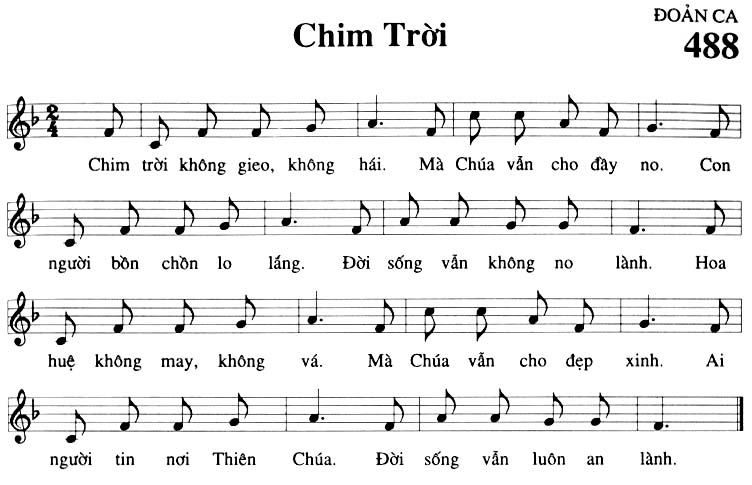 1. Chim trời không gieo, không hái. Mà Chúa vẫn cho đầy no. Con người bồn chồn lo lắng. Đời sống vẫn không no lành. 2. Hoa huệ không may, không vá. Mà Chúa vẫn cho đẹp xinh. Ai người tin nơi Thiên Chúa. Đời sống vẫn luôn an lành.