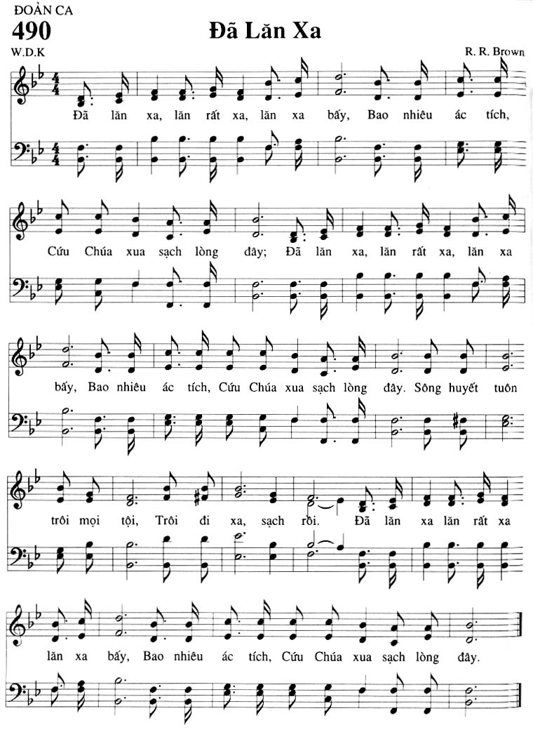 1. Đã lăn xa, lăn rất xa, lăn xa bấy, Bao nhiêu ác tích, Cứu Chúa xua sạch lòng đây. Sông huyết tuôn trôi mọi tội, Trôi đi xa, sạch rồi. Điệp khúc: Đã lăn xa lăn rất xa lăn xa bấy, Bao nhiêu ác tích, Cứu Chúa xua sạch lòng đây.