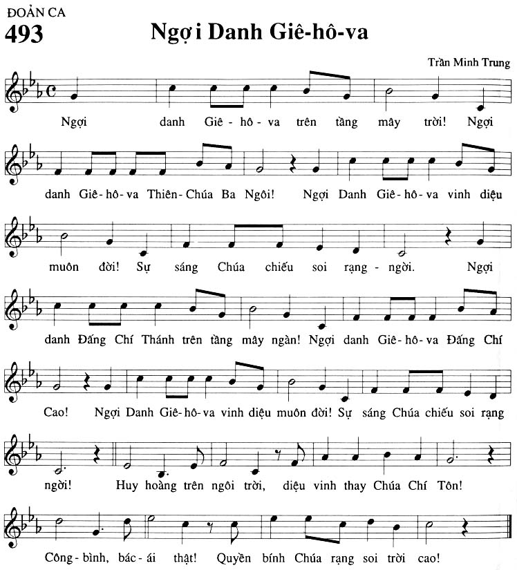 1. Ngợi danh Giê-hô-va trên tầng mây trời! Ngợi danh Giê-hô-va Thiên-Chúa Ba Ngôi! Ngợi Danh Giê-hô-va vinh diệu muôn đời! Sự sáng Chúa chiếu soi rạng ngời. Ngợi danh Đấng Chí Thánh trên tầng mây ngàn! Ngợi danh Giê-hô-va Đấng Chí Cao! Ngợi Danh Giê-hô-va vinh diệu muôn đời! Sự sáng Chúa chiếu soi rạng ngời! Huy hoàng trên ngôi trời, diệu vinh thay Chúa Chí Tôn! Công - bình, bác - ái thật! Quyền bính Chúa rạng soi trời cao!