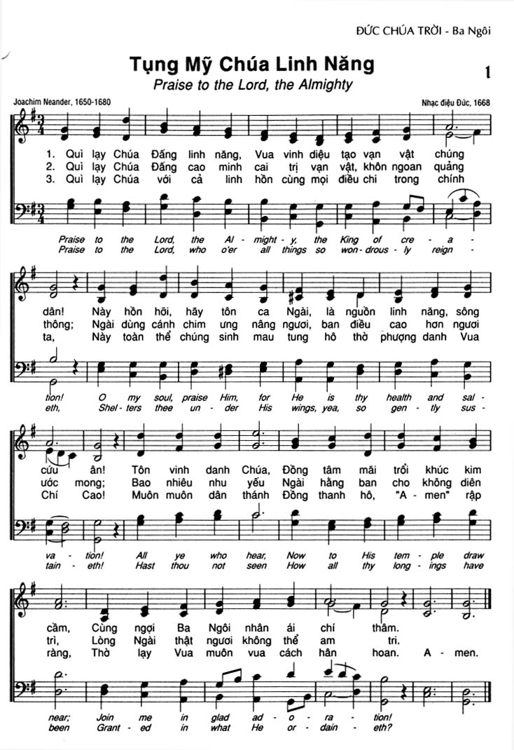 1. Quì lạy Chúa Đấng linh năng, Vua vinh diệu tạo vạn vật chúng dân! Này hồn hỡi, hãy tôn ca Ngài, là nguồn linh năng, sông cứu ân! Tôn vinh danh Chúa, Đồng tâm mãi trổi khúc kim cầm, Cùng ngợi Ba Ngôi nhân ái chí thâm. 2. Quì lạy Chúa Đấng cao minh cai trị vạn vật, khôn ngoan quảng thông; Ngài dùng cánh chim ưng nâng ngươi, ban điều cao hơn ngươi trì, Ước mong; Bao nhiêu nhu yếu Ngài hằng ban cho không diễn tri. Lòng Ngài thật ngươi không thể am tri. 3. Quì lạy Chúa với cả linh hồn cùng mọi điều chỉ trong chính ta, Này toàn thể chúng sinh mau tung hô thờ phượng danh Vua ràng, Chí Cao! Muôn muôn dân thánh Đồng thanh hô, "A-men" rập ràng. Thờ lạy Vua muôn vua cách hân hoan. A-men.