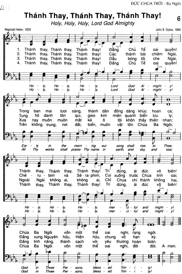 1. Thánh thay, Thánh thay, Thánh thay! Đằng Chủ Tể oai quyền! Trong ban mai tươi sáng, thánh dân đồng dâng khúc hoan ca; Thánh thay, Thánh thay, Thánh thay! Trí dũng, ái đức vô biên! Chúa Ba Ngôi vốn một thể oai nghi, rạng ngời. 2. Thánh thay, Thánh thay, Thánh thay! Các thánh bái chiêm Ngài, Tung hô danh tôn quí, gieo kim miện quanh biển lưu ly; Chê-ru-bim và Sê-ra-phim, Cúi xuống trước Chúa linh oai; Đấng xưng Nguyên hữu, Hiện hữu, chung vô hạn kỳ. 3. Thánh thay, Thánh thay, Thánh thay! Dẫu bóng tối che Ngài, Xưa nay muôn muôn mắt kẻ ô tội khôn thấy thiên nhan; Ngoài Ngài không ai, không ai, Chỉ Chúa chí thánh không hai, Đấng linh năng, thánh sạch với yêu thương hoàn toàn. 4. Thánh thay, Thánh thay, Thánh thay! Đấng Chủ Tể oai quyền! Trên không trung, nơi đất, biển, muôn vật tôn Chúa Ba Ngôi; Thánh thay, Thánh thay, Thánh thay! Trí dũng, ái đức vô biên! Chúa Ba Ngôi vốn một thể oai nghi, đời đời. A-men.