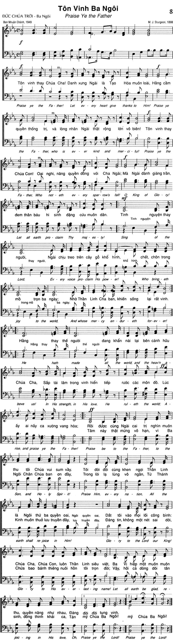 1. Tôn vinh thay Chúa Cha! Danh xưng Ngài là Tạo Hóa muôn loài, Hằng cầm quyền thống trị, và lòng nhân Ngài thật rộng lớn vô biên! Tôn vinh thay Chúa Cha, Sắp tái lâm trong vinh hiển tiếp rước các môn đồ. Lúc ấy ai nấy ca xướng vang hòa; Rồi được cùng Ngài cai trị nghìn muôn thu tôi Chúa vui sum vầy. Tôi đời đời cùng khen ngợi Thần Linh thu, quyền năng như nhau, Đáng đời đời tụng vinh. 2. Chúa Con! Oai nghi, năng quyền đồng với Cha Ngài; Mà Ngài đành giáng trần, đem thân báu hi sinh đặng cứu muôn dân. Tình nguyện thay người, Ngài chịu treo trên cây gỗ khổ hình, khổ hình, chết, chôn trong mồ trọn ba ngày; Nhờ Thần Linh Cha ban, khiến sống lại rất vinh. Hằng thay thế người đang khẩn nài tại bên cánh hữu Ngôi Chân Chúa ban ơn đây, Trong lời lạ lùng vô ngần, Từ Thánh sinh, đồng thinh khải ca, Tán mỹ Chúa Ba Ngôi! 3. Tình nguyện thay người, Ngài chịu treo trên cây gỗ khổ hình, khổ hình, chết, chôn trong mồ trọn ba ngày; Nhờ Thần Linh Cha ban, khiến sống lại rất vinh. Hằng thay thế người đang khẩn nài tại bên cánh hữu Ngôi Chân Chúa ban ơn đây, Trong lời lạ lùng vô ngần, Từ Thánh sinh, đồng thinh khải ca, Tán mỹ Chúa Ba Ngôi! Tám này thật mừng vô hạn, vì Ba là Ngôi thứ ba quyền oai, Ngôi quyền oai, Dắt tôi vào mọi lỗi công bình: Kinh muôn thuở lưu truyền đây, lưu truyền đây. Đáng tin, không một nét sai dời, Chúa Cha, Chúa Con, luôn Thần Linh siêu việt, Ba Vị hiệp một muôn muôn Chứa bao bánh thiêng nuôi hồn tôi trọn đời; Vậy, hỡi cả dòng dõi tân mỹ Chúa Ba Ngôi!