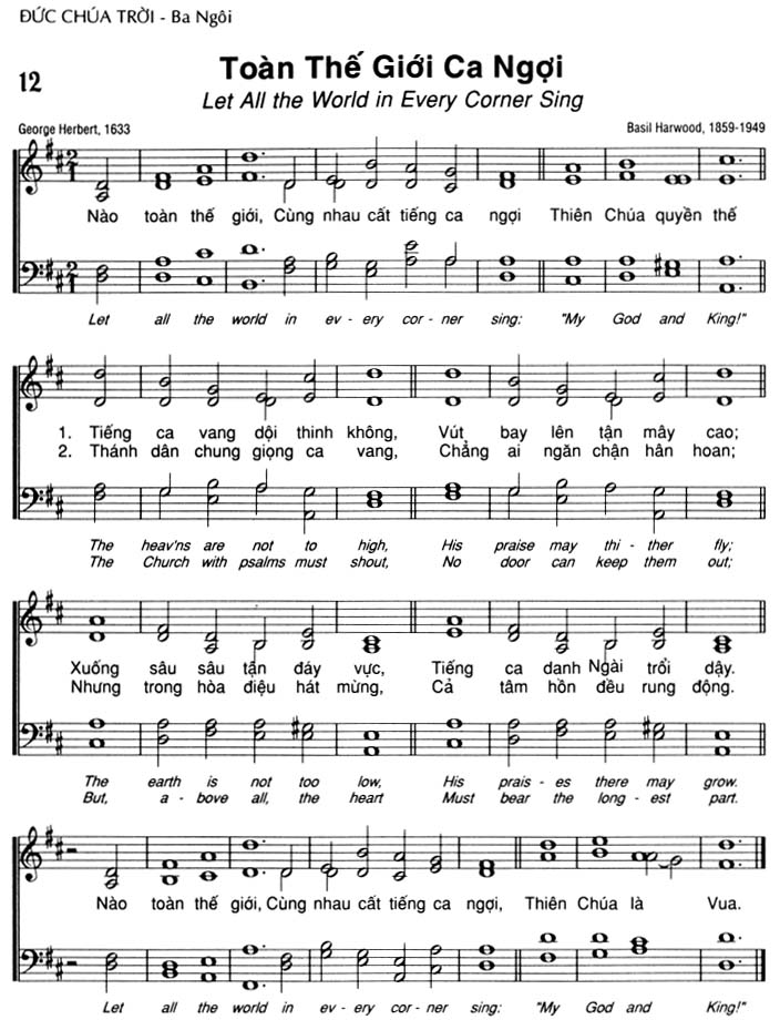 1. Tiếng ca vang dội thinh không, Vút bay lên tận mây cao; Xuống sâu sâu tận đáy vực, Tiếng ca danh Ngài trổi dậy. 2. Thánh dân chung giọng ca vang, Chẳng ai ngăn chận hân hoan; Nhưng trong hòa điệu hát mừng, Cả tâm hồn đều rung động. Điệp khúc: Nào toàn thế giới, Cùng nhau cất tiếng ca ngợi Thiên Chúa quyền thế Nào toàn thế giới, Cùng nhau cất tiếng ca ngợi, Thiên Chúa là Vua.