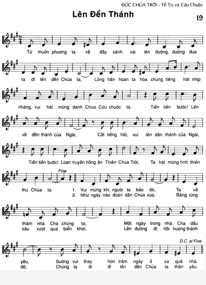 1. Vui mừng khi người ta bảo tôi, Ta về thăm nhà Cha chúng ta; Một ngày trong nhà Cha dầu yêu, Sướng vui thay hơn trăm ngày ở xa quê nhà. 2. Như ngày nào đoàn dân Chúa xưa, Băng rừng sâu vượt qua biển khơi; Lên đường đi hồi hương thánh đô, Chúng ta đi đi lên đền Chúa ta thân yêu. Điệp khúc: Từ muôn phương ta về đây sánh vai lên đường, đường đưa ta đi lên đền Chúa ta, Lòng hân hoan ta hòa chung tiếng hát nhịp nhàng, vui hát mừng danh Chúa Cứu chuộc ta. Tiến tiến bước! Lên về đền thánh của Ngài, Cất tiếng hát, vui lên dân thánh của Ngài, Tiến tiến bước! Loan truyền hồng ân Thiên Chúa Trời, Ta hát mừng tình thiên thu Chúa ta.