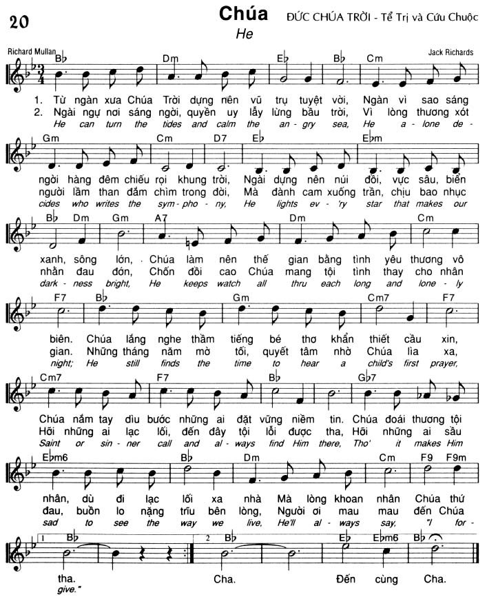1. Từ ngàn xưa Chúa Trời dựng nên vũ trụ tuyệt vời, Ngàn vì sao sáng ngời hàng đêm chiếu rọi khung trời, xanh, sông lớn, Chúa làm nên thế gian bằng tình yêu thương vô biên. Chúa lắng nghe thầm tiếng bé thơ khẩn thiết cầu xin, Chúa nắm tay dìu bước những ai đặt vững niềm tin. Chúa đoái thương tội nhân, dù đi lạc lối xa nhà. 2. Ngài ngự nơi sáng ngời, quyền uy lẫy lừng bầu trời, Vì lòng thương xót người lầm than đắm chìm trong đời, Mà đành cam xuống trần, chịu bao nhục nhằn đau đớn, Chốn đồi cao Chúa mang tội tình thay cho nhân gian. Những tháng năm mờ tối, quyết tâm nhờ Chúa lìa xa, Hỡi những ai lạc lối, đến đây tội lỗi được tha, Hỡi những ai sầu đau, buồn lo nặng trĩu bên lòng. Điệp khúc: Mà lòng khoan nhân Chúa thứ tha. Người ơi mau mau đến Chúa Cha. give. Cha. Đến cùng Cha.