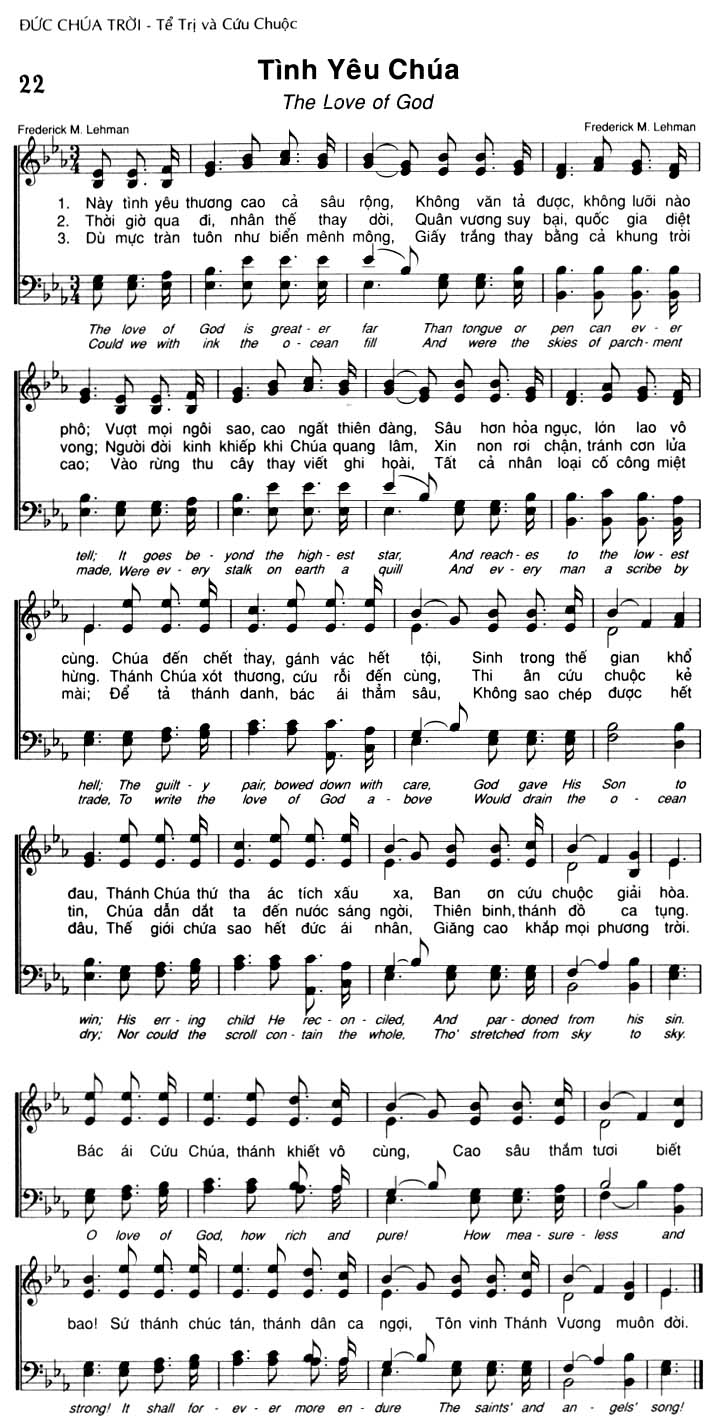 1. Này tình yêu thương cao cả sâu rộng, Không văn tả được, không lưỡi nào phô; Vượt mọi ngôi sao, cao ngất thiên đàng, Sâu hơn hỏa ngục, lớn lao vô cùng. Chúa đến chết thay, gánh vác hết tội, Sinh trong thế gian khổ đau, Thánh Chúa thứ tha ác tích xấu xa, Ban ơn cứu chuộc giải hòa. 2. Thời giờ qua đi, nhân thể thay dời, Quân vương suy bại, quốc gia diệt vong; Người đời kinh khiếp khi Chúa quang lâm, Xin non rơi chận, tránh cơn lửa hừng. Thánh Chúa xót thương, cứu rỗi đến cùng, Thi ân cứu chuộc kẻ tin, Chúa dẫn dắt ta đến nước sáng ngời, Thiên bình, thánh đồ ca tụng. 3. Dù mực tràn tuôn như biển mênh mông, Giấy trắng thay bằng cả khung trời cao; Vào rừng thu cây thay viết ghi hoài, Tất cả nhân loại cố công miệt mài: Để tả thánh danh, bác ái thẳm sâu, Không sao chép được hết đâu, Thế giới chứa sao hết đức ái nhân, Giăng cao khắp mọi phương trời. Điệp khúc: Bác ái Cứu Chúa, thánh khiết vô cùng, Cao sâu thắm tươi biết bao! Sứ thánh chúc tán, thánh dân ca ngợi, Tôn vinh Thánh Vương muôn đời.