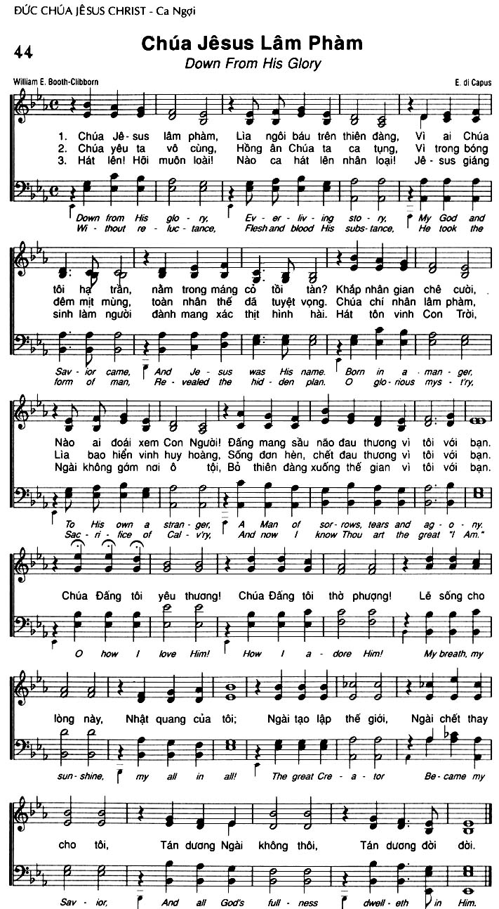 1. Chúa Jê-sus lâm phàm, Lìa ngôi báu trên thiên đàng, tôi hạ trần, nằm trong máng cỏ tôi tàn? Nào ai đoái xem Con Người! Đấng mang sầu não đau thương vì tôi với bạn. 2. Chúa yêu ta vô cùng, Hồng ân Chúa ta ca tụng, đêm mịt mùng, toàn nhân thế đã tuyệt vọng. Chúa chí nhân lâm phàm, Lia bao hiển vinh huy hoàng, Sống đơn hèn, chết đau thương vì tôi với bạn. 3. Hát lên! Hỡi muôn loài! Nào ca hát lên nhân loại! sinh làm người đành mang xác thịt hình hài. Hát tôn vinh Con Trời, Ngài không gớm nơi ô tội, Bỏ thiên đàng xuống thế gian vì tôi với bạn. Điệp khúc: Chúa Đấng tôi yêu thương! Chúa Đấng tôi thờ phượng! Lẽ sống cho lòng này, Nhật quang của tôi; Ngài tạo lập thế giới, Ngài chết thay cho tôi, Tán dương Ngài không thôi, Tán dương đời đời.