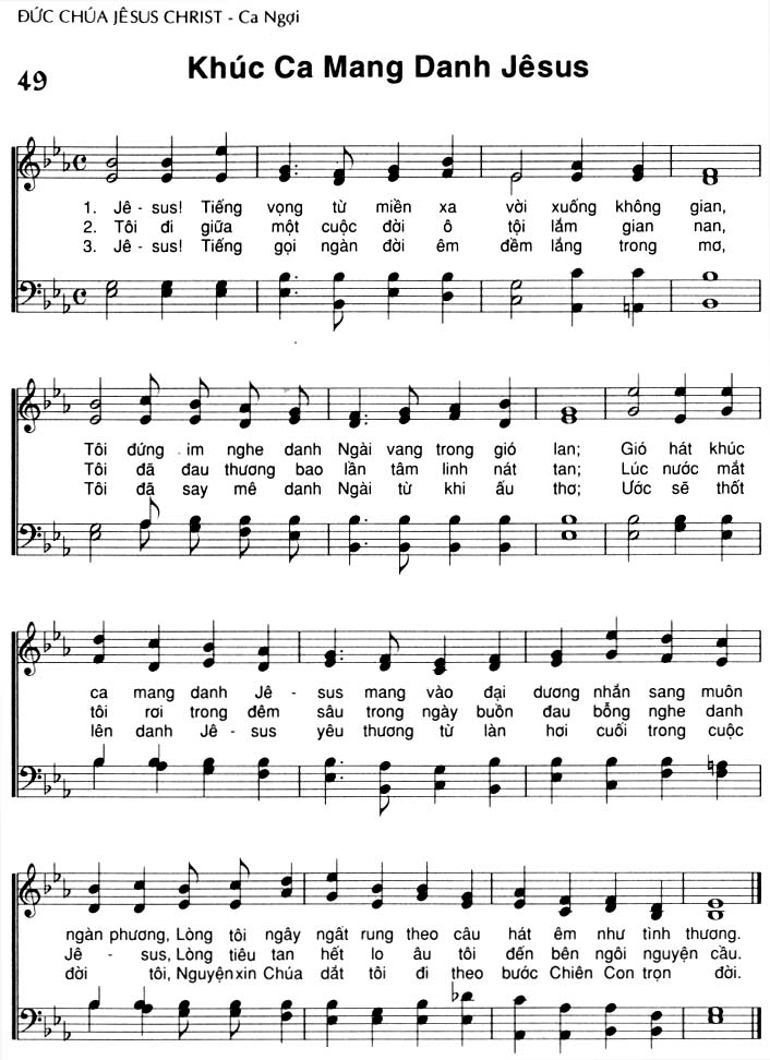 1. Jêsus! Tiếng vọng từ miền xa vời xuống không gian, Tôi đứng im nghe danh Ngài vang trong gió lan; Gió hát khúc ca mang danh Jêsus mang vào đại dương nhẫn sang muôn ngàn phương, Lòng tôi ngây ngất rung theo câu hát êm như tình thương. 2. Tôi đi giữa một cuộc đời tội lắm gian nan, Tôi đã đau thương bao lần tâm linh nát tan; Lúc nước mắt tôi rơi trong đêm sâu trong ngày buồn đau bỗng nghe danh Jêsus, Lòng tiêu tan hết lo âu tôi đến bên ngôi nguyện cầu. 3. Jêsus! Tiếng gọi ngàn đời êm đềm lắng trong mơ, Tôi đã say mê danh Ngài từ khi ấu thơ; Ước sẽ thốt lên danh Jêsus yêu thương từ làn hơi cuối trong cuộc đời tôi, Nguyện xin Chúa dắt tôi đi theo bước Chiên Con trọn đời.