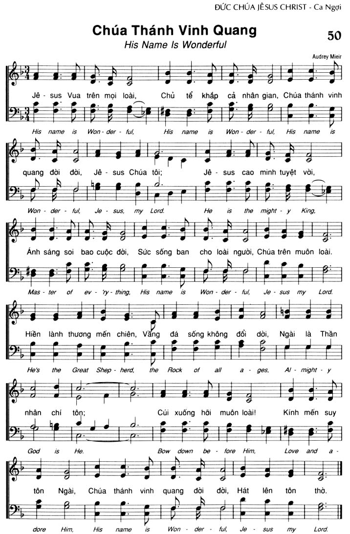 Điệp khúc: Jê-sus Vua trên mọi loài, Chủ tể khắp cả nhân gian, Chúa thánh vinh quang đời đời, Jê-sus Chúa tôi; Jê-sus cao minh tuyệt vời, Ánh sáng soi bao cuộc đời, Sức sống ban cho loài người, Chúa trên muôn loài. Hiền lành thương mến chiên, Vầng đá sống không đổi dời, Ngài là Thần nhân chí tôn; Cúi xuống hỡi muôn loài! Kính mến suy tôn Ngài, Chúa thánh vinh quang đời đời, Hát lên tôn thờ.