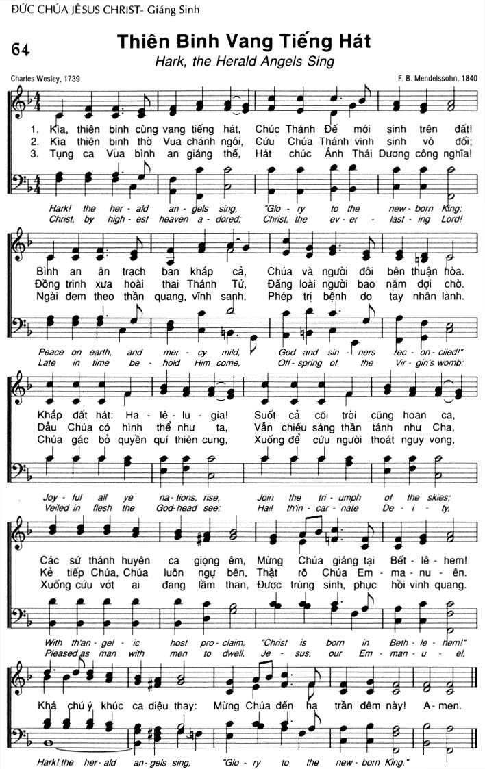 1. Kìa, thiên binh cùng vang tiếng hát, Chúc Thánh Đế mới sinh trên đất! Bình an ân trạch ban khắp cả, Chúa và người đôi bên thuận hòa. Khắp đất hát: Ha-lê-lu-gia! Suốt cả cõi trời cũng hoan ca, Các sứ thánh huyên ca giọng êm, Mừng Chúa giáng tại Bết-lê-hem! 2. Kìa thiên binh thờ Vua chánh ngôi, Cứu Chúa Thánh vĩnh sinh vô đối; Đồng trinh xưa hoài thai Thánh Tử, Đấng loài người bao năm đợi chờ. Dẫu Chúa có hình thể như ta, Vẫn chiếu sáng thần tánh như Cha, Kẻ tiếp Chúa, Chúa luôn ngự bên, Thật rõ Chúa Em-ma-nu-ên. 3. Tụng ca Vua bình an giáng thế, Hát chúc Ánh Thái Dương công nghĩa! Ngài đem theo thần quang, vĩnh sanh, Phép trị bệnh do tay nhân lành. Chúa gác bỏ quyền quí thiên cung, Xuống để cứu người thoát nguy vong, Xuống cứu vớt ai đang lầm than, Được trùng sinh, phục hồi vinh quang. Điệp khúc: Khá chú ý, khúc ca diệu thay: Mừng Chúa đến hạ trần đêm này! A-men.