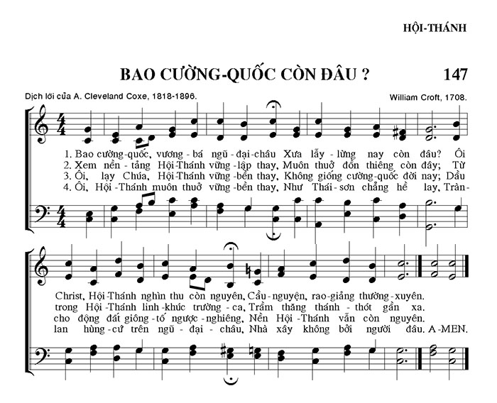 1. Bao cường quốc, vương bá ngũ đại châu, xưa lẫy lừng nay còn đâu? Ôi, Christ, Hội-Thánh nghìn thu còn nguyên, cầu nguyện, rao giảng thường xuyên. 2. Xem nền tảng Hội-Thánh vững lập thay, muôn thuở đồn thiêng còn đây; từ trong Hội-Thánh linh khúc trường ca, trầm thăng thánh thốt gần xa. 3. Ôi, lạy Chúa, Hội-Thánh vững bền thay, không giống cường quốc cõi nay; dầu cho dòng đất giống tổ ngược nghiêng, nên Hội-Thánh vẫn còn nguyên. 4. Ôi, Hội-Thánh muôn thuở vững bền thay, như Thái Sơn chẳng hề lay, lan hùng cư trên ngũ đại châu, nhà xây không bởi người đâu. A-MEN.