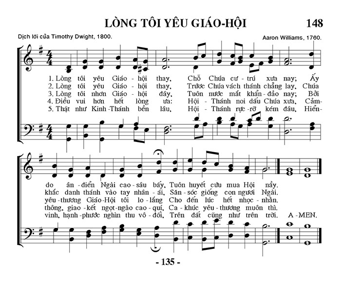 1. Lòng tôi yêu Giáo hội thay, Chỗ Chúa cư trú xưa nay; Ấy do ân điển Ngài cao sâu bấy, Tuôn huyết cứu mua Hội nầy. 2. Lòng tôi yêu Giáo hội thay, Trước Chúa vách thánh chẳng lay, Chúa khắc danh thánh vào tay nhân ái, Săn sóc giống con ngươi Ngài. 3. Lòng tôi nhơn Giáo hội đây, Tuôn nước mắt khẩn đảo nay; Bởi yêu thương Giáo Hội tôi lo lắng Cho đến lúc hết nhọc nhằn. 4. Điều vui hơn hết lòng ưa: Hội Thánh noi dấu Chúa xưa, Cảm thông, giao kết ngọt ngào cao quí, Ca khúc yêu thương muôn thì. 5. Thật như Kinh Thánh bền lâu, Hội Thánh rực rỡ kém đâu, Hiển vinh, hạnh phước nghìn thu vô đối, Trên đất cũng như trên trời. A-MEN.
