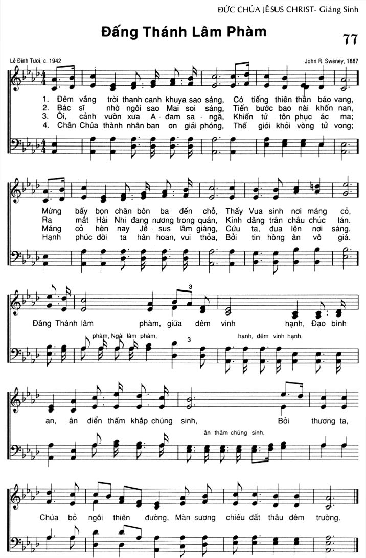 1. Đêm vắng trời thanh canh khuya sao sáng, Có tiếng thiên thần báo vang, Mừng bấy bọn chăn bôn ba đến chỗ, Thấy Vua sinh nơi máng cỏ, Đấng Thánh lâm phàm, giữa đêm vinh hạnh, Đạo bình an, ân điển thẩm khắp chúng sinh, Chúa bỏ ngôi thiên đường, Màn sương chiếu đất thâu đêm trường. 2. Bác sĩ nhờ ngôi sao Mai soi sáng, Tiến bước bao nài khốn nan, Ra mắt Hài Nhi đang nương trong quán, Kính dâng trân châu chúc tán. Đấng Thánh lâm phàm, giữa đêm vinh hạnh, Đạo bình an, ân điển thẩm khắp chúng sinh, Chúa bỏ ngôi thiên đường, Màn sương chiếu đất thâu đêm trường. 3. Ôi, cảnh vườn xưa A-đam sa ngã, Khiến tử tôn phục ác ma; Máng cỏ hèn nay Jê-sus lâm giáng, Cứu ta, đưa lên nơi sáng. Đấng Thánh lâm phàm, giữa đêm vinh hạnh, Đạo bình an, ân điển thẩm khắp chúng sinh, Chúa bỏ ngôi thiên đường, Màn sương chiếu đất thâu đêm trường. 4. Chân Chúa thành nhân ban ơn giải phóng, Thế giới khỏi vòng tử vong; Hạnh phúc đời ta hân hoan, vui thỏa, Bởi tin hồng ân vô giá. Đấng Thánh lâm phàm, giữa đêm vinh hạnh, Đạo bình an, ân điển thẩm khắp chúng sinh, Chúa bỏ ngôi thiên đường, Màn sương chiếu đất thâu đêm trường.