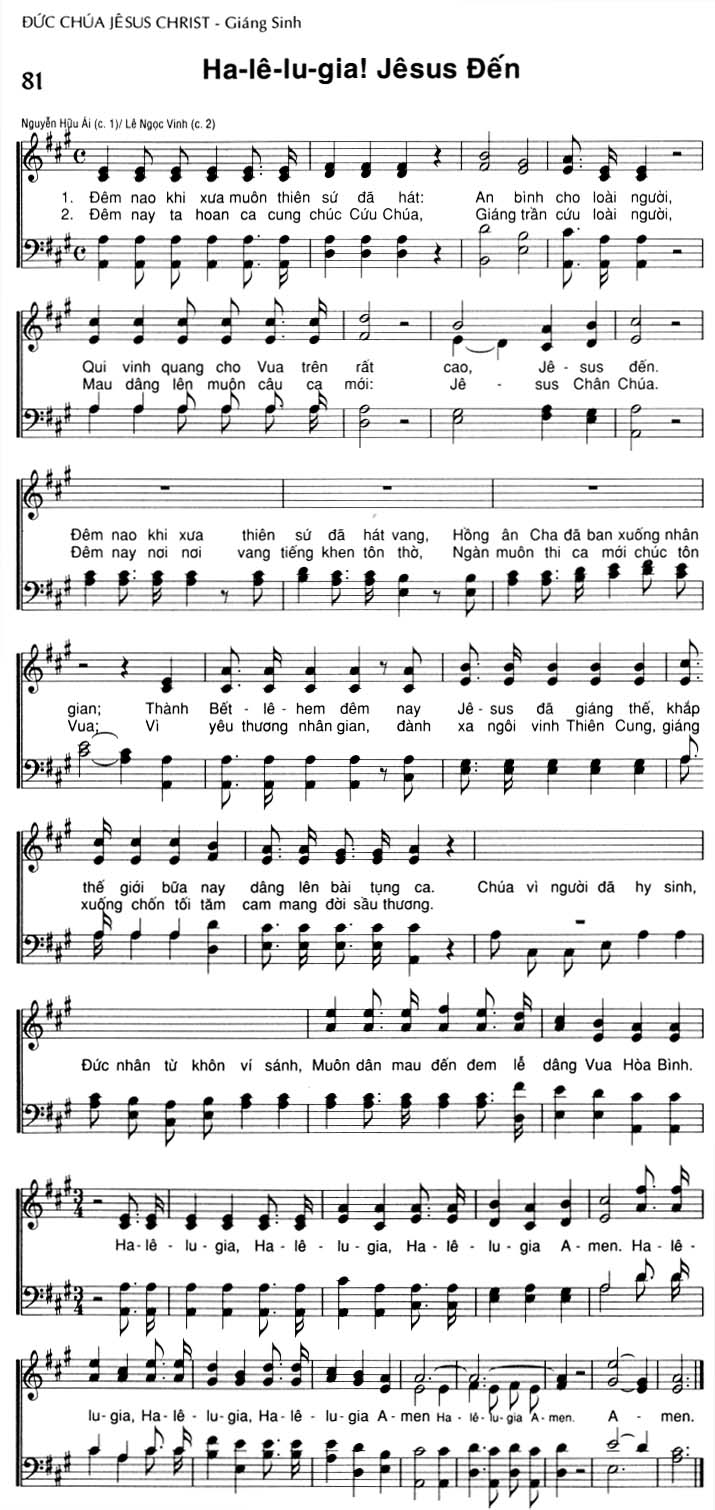 1. Đêm nao khi xưa muôn thiên sứ đã hát: An bình cho loài người, Qui vinh quang cho Vua trên rất cao, Jêsus đến. Đêm nao khi xưa thiên sứ đã hát vang, Hồng ân Cha đã ban xuống nhân gian; Thành Bết-lê-hem đêm nay Jêsus đã giáng thế, khắp thế giới bữa nay dâng lên bài tụng ca. Đức nhân từ khôn ví sánh, Muôn dân mau đến đem lễ dâng Vua Hòa Bình. 2. Đêm nay ta hoan ca cung chúc Cứu Chúa, Giáng trần cứu loài người, Mau dâng lên muôn câu ca mới: Jêsus Chân Chúa. Đêm nay nơi nơi vang tiếng khen tôn thờ, Ngàn muôn thi ca mới chúc tôn Vua; Vì yêu thương nhân gian, đành xa ngôi vinh Thiên Cung, giáng xuống chốn tối tăm cam mang đời sầu thương. Chúa vì người đã hy sinh, Muôn dân mau đến đem lễ dâng Vua Hòa Bình. Điệp khúc: Ha-lê-lu-gia, Ha-lê-lu-gia, Ha-lê-lu-gia A-men. Ha-lê-lu-gia, Ha-lê-lu-gia, Ha-lê-lu-gia A-men. A-men.