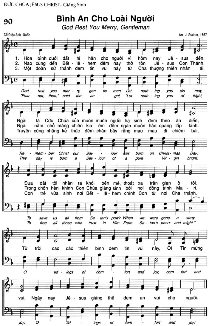 1. Hòa bình dưới đất hỉ hân cho người vì hôm nay Jê-sus đến, Ngài là Cứu Chúa của muôn muôn người hạ sinh đem theo ân điển, Đưa dắt tội nhân ra khỏi bến mê, thoát xa trần gian ô tối. Từ trời cao các thiên binh đem tin vui này, Ô! Tin mừng vui, Ngày nay Jê-sus giáng thế đem an vui cho người. 2. Nào cùng đến Bết-lê-hem đêm nay thờ tôn Jê-sus Con Thánh, Ngài nằm chỗ máng chiên kia êm đềm ngàn muôn hào quang lấp lánh. Trong chốn hèn khinh Con Chúa giáng sinh bởi nơi đồng trinh Ma-ri. Từ trời cao các thiên binh đem tin vui này, Ô! Tin mừng vui, Ngày nay Jê-sus giáng thế đem an vui cho người. 3. Một đoàn sứ thánh đem tin vui này từ Cha thượng thiên nhân ái, Truyền cùng những kẻ thức đêm chăn bầy rằng mau mau đi chiêm bái, Con trẻ vừa sinh nơi Bết-lê-hem chính Con từ nơi Cha thánh. Từ trời cao các thiên binh đem tin vui này, Ô! Tin mừng vui, Ngày nay Jê-sus giáng thế đem an vui cho người.