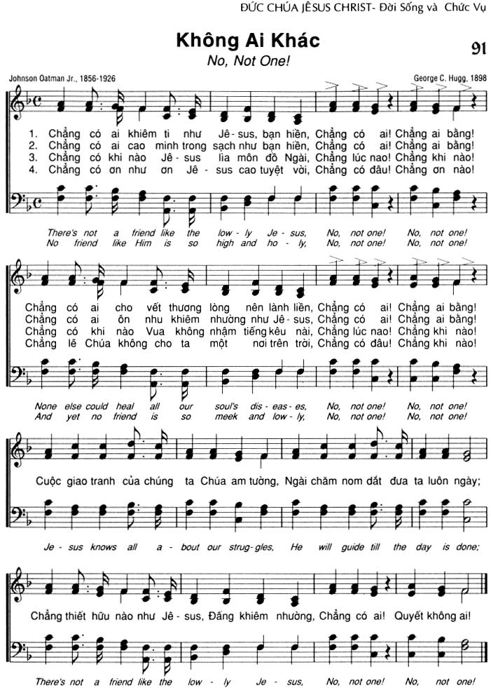 1. Chẳng có ai khiêm ti như Jê-sus, bạn hiền, Chẳng có ai! Chẳng ai bằng! Chẳng có ai cho vết thương lòng nên lành liền, Chẳng có ai! Chẳng ai bằng! Cuộc giao tranh của chúng ta Chúa am tường, Ngài chăm nom dắt đưa ta luôn ngày; Chẳng thiết hữu nào như Jê-sus, Đấng khiêm nhường, Chẳng có ai! Quyết không ai! 2. Chẳng có ai cao minh trong sạch như bạn hiền, Chẳng có ai! Chẳng ai bằng! Chẳng có ai ôn nhu khiêm nhường như Jê-sus, Chẳng có ai! Chẳng ai bằng! Cuộc giao tranh của chúng ta Chúa am tường, Ngài chăm nom dắt đưa ta luôn ngày; Chẳng thiết hữu nào như Jê-sus, Đấng khiêm nhường, Chẳng có ai! Quyết không ai! 3. Chẳng có khi nào Jê-sus lìa môn đồ Ngài, Chẳng lúc nao! Chẳng khi nào! Chẳng có khi nào Vua không nhậm tiếng kêu nài, Chẳng lúc nao! Chẳng khi nào! Cuộc giao tranh của chúng ta Chúa am tường, Ngài chăm nom dắt đưa ta luôn ngày; Chẳng thiết hữu nào như Jê-sus, Đấng khiêm nhường, Chẳng có ai! Quyết không ai! 4. Chẳng có ơn như ơn Jê-sus cao tuyệt vời, Chẳng có đâu! Chẳng ơn nào! Chẳng lẽ Chúa không cho ta một nơi trên trời, Chẳng có đâu! Chẳng khi nào! Cuộc giao tranh của chúng ta Chúa am tường, Ngài chăm nom dắt đưa ta luôn ngày; Chẳng thiết hữu nào như Jê-sus, Đấng khiêm nhường, Chẳng có ai! Quyết không ai!