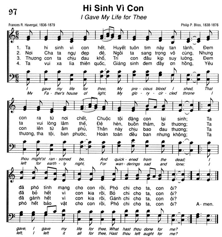 1. Ta hi sinh vì con hết, Huyết tuôn tim này tan tành, Đem con ra từ nơi chết, Chuộc tội đặng con lại sinh; đã phó tính mạng cho con rồi, Phó chi cho ta, con ôi? 2. Nơi Cha ta ngự đẹp đẽ, Ngôi ta sang trọng vô cùng, Nhưng ta vui lòng lâm thế, Để hèn, buồn thảm, bị thương; đã bỏ hết vì con kia rồi, Bỏ chi cho ta, con ôi? 3. Thương con ta chịu đau khổ, Trí con đâu kịp suy lường, Con lên từ âm phủ, Thân này chịu bao đau thương; đã gánh hết vì con kia rồi, Gánh chi cho ta, con ôi? 4. Ta vui xa lìa thiên quốc, Giáng sinh đem đầy ơn hồng, Yêu thương, tha tội, ban phước, Hoàn toàn đều ban nhưng không; phó hết bảo vật cho con rồi, Phó chi cho ta, con ôi? Outro: A-men.