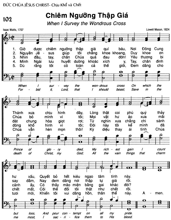 1. Giờ được chiêm ngưỡng thập giá quí báu, Nơi Đông Cung Thánh xưa chịu hình đây, Lòng thật coi phú quý thảy hư xấu, Quyết bỏ hết kiêu ngạo tâm tính này. 2. Nguyện Jêsus giúp tôi chẳng khoe khoang, Duy khoe ơn Chúa bỏ mình vì tôi; Mọi vật hư ảo xưa nay đắm say, Nay đem dâng nơi thập tự giá rồi. 3. Nhìn đầu, tay, chân Chúa quá đau đớn! Yêu thương bị đóng khổ hình vì tôi; Từ nghìn xưa chẳng chi sánh cảnh ấy, Có thấy mão miện bằng gai khác đời? 4. Mình Ngài lưu huyết dường khoác xích y, Tay, chân đinh Chúa vẫn hèn mọn thôi! Đời này tôi kể mình đã chết mất, Cõi thế đối tôi thật như chết rồi. 5. Dù rằng tôi có toàn cả thế giới, Đem dâng cho Chúa Kỳ diệu thay ái tình Chúa tươi mới, Khiến tôi vui dâng hồn, thân thể này. A - men.
