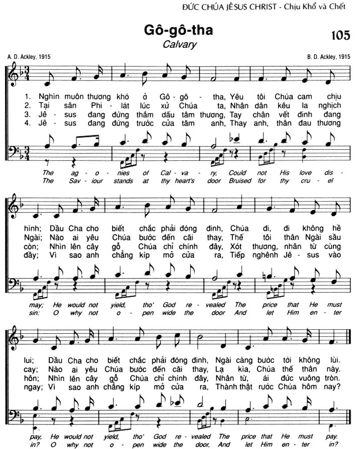 1. Nghìn muôn thương khó ở Gô-gô-tha, Yêu tôi Chúa cam chịu hình; Dầu Cha cho biết chắc phải đóng đinh, Chúa di, di không hề lui; Dầu Cha cho biết chắc phải đóng đinh, Ngài càng bước tới không lùi. 2. Tại sân Phi-lát lúc xử Chúa ta, Nhân dân kêu la nghịch Ngài; Nào ai yêu Chúa bước đến cãi thay, Thế tôi thân Ngài sầu cay; Nào ai yêu Chúa bước đến cái thay, Lạ kìa, Chúa thế thân này. 3. Jê-sus đang đứng thắm dấu tâm thương, Tay chân vết đinh dang còn; Nhìn lên cây gỗ Chúa chỉ chính đây, Xót thương, nhân từ cùng hôn; Nhìn lên cây gỗ Chúa chỉ chính đây, Nhân từ, ái đức vuông tròn. 4. Jê-sus đang đứng trước cửa tâm anh, Thay anh, thân đau thương đầy; Vì sao anh chẳng kíp mở cửa ra, Tiếp nghênh Jê-sus vào ngay; Vì sao anh chẳng kíp mở cửa ra, Thành thật rước Chúa hôm nay?