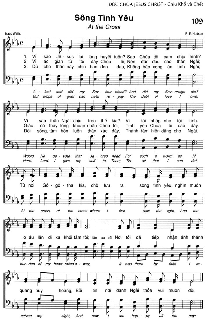 1. Vì sao Jêsus lại láng huyết tuôn? Sao Chúa tôi cam chịu hình? Vì sao thân Ngài chịu treo thế kia? Vì tôi nhớp nhơ tội tình. 2. Vì ác gian từ tôi đây Chúa ôi, Nên đớn đau cho thân Ngài; Giàu có thay lòng khoan nhân Chúa tôi, Tình yêu Chúa ôi cao dày. 3. Dù cho thân này chịu bao đớn đau, Không báo xong ân tình Ngài; Đời sống, tâm hồn luôn thân xác đây, Thành tâm hiến dâng cho Ngài. chorus. Từ nơi Gô-gô-tha kia, chỗ lưu ra sông tình yêu, nghìn muôn lo âu lăn đi xa khỏi tâm tôi; lăn xa rồi Nơi tôi đã tiếp nhận ánh thánh quang huy hoàng, Bởi tin nơi danh Ngài thỏa vui muôn đời.