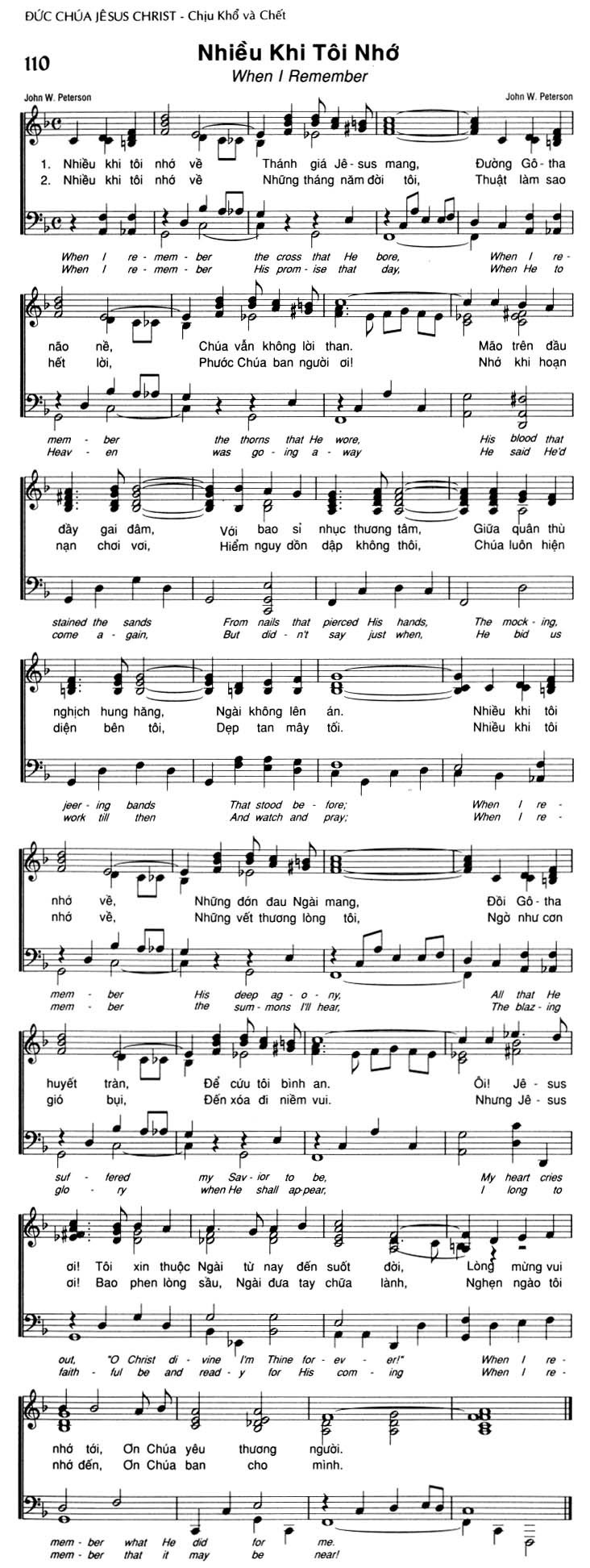 1. Nhiều khi tôi nhớ về Thánh giá Jêsus mang, Đường Gô-tha não nề, Chúa vẫn không lời than. Mão trên đầu đầy gai đâm, Với bao sỉ nhục thương tâm, Giữa quân thù nghịch hung hăng, Ngài không lên án. Nhiều khi tôi nhớ về Những đớn đau Ngài mang, Đồi Gô-tha huyết tràn, Để cứu tôi bình an. Ôi! Jêsus ơi! Tôi xin thuộc Ngài từ nay đến suốt đời, nhớ tới, Ơn Chúa yêu thương người. 2. Nhiều khi tôi nhớ về Những tháng năm đời tôi, Thuật làm sao hết lời, Phước Chúa ban người ơi! Nhớ khi hoạn nạn chơi vơi, Hiểm nguy dồn dập không thôi, Chúa luôn hiện diện bên tôi, Dẹp tan mây tối. Nhiều khi tôi nhớ về Những vết thương lòng tôi, Ngờ như cơn gió bụi, Đến xóa đi niềm vui. Nhưng Jêsus ơi! Bao phen lòng sầu, Ngài đưa tay chữa lành, Nghẹn ngào tôi nhớ đến, Ơn Chúa ban cho mình.