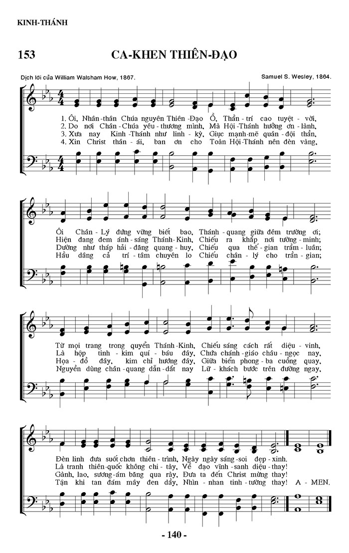 1. Ôi, Nhân - thân Chúa nguyên Thiên Đạo Ổ, Thần - trí cao tuyệt vời, Ôi Chân - Lý đứng vững biết bao, Thánh - quang giữa đêm trường ơi; Từ mọi trang trong quyển Thánh Kinh, Chiếu sáng cách rất diệu - vinh, Đèn linh đưa suốt chơn thiên - trình, Ngày ngày sáng soi đẹp - xinh. 2. Do nơi Chân - Chúa yêu - thương mình, Mà Hội Thánh hưởng ơn - lành, Hiện đang đem ánh - sáng Thánh Kinh, Chiếu ra khắp nơi tường - minh; Là hộp tinh - kim quí - báu đây, Chứa chánh - giáo châu ngọc nay, Là tranh thiên - quốc không chi tày, Về đạo vĩnh - sanh diệu - thay! 3. Xưa nay Kinh Thánh như linh kỳ, Giục mạnh mẽ quân - đội thần, Dường như tháp hải - đăng quang - huy, Chiếu qua thế - gian trầm - luân; Họa đồ đây, kim chỉ hướng đây, Giữa biển phong ba cuồng quay, Gành, lao, sương - ám băng qua rày, Đưa ta đến Christ mừng thay! 4. Xin Christ thân - ái, ban ơn cho Toàn Hội Thánh nên đèn vàng, Hầu dâng cả trí - tâm chuyên lo Chiếu chân - lý cho trần - gian; Nguyễn dùng chân - quang dẫn - dắt nay Lữ - khách bước trên đường ngay, Tận khi tan đám mây đen dầy, Nhìn - nhan tinh - tường thay! A - MEN.