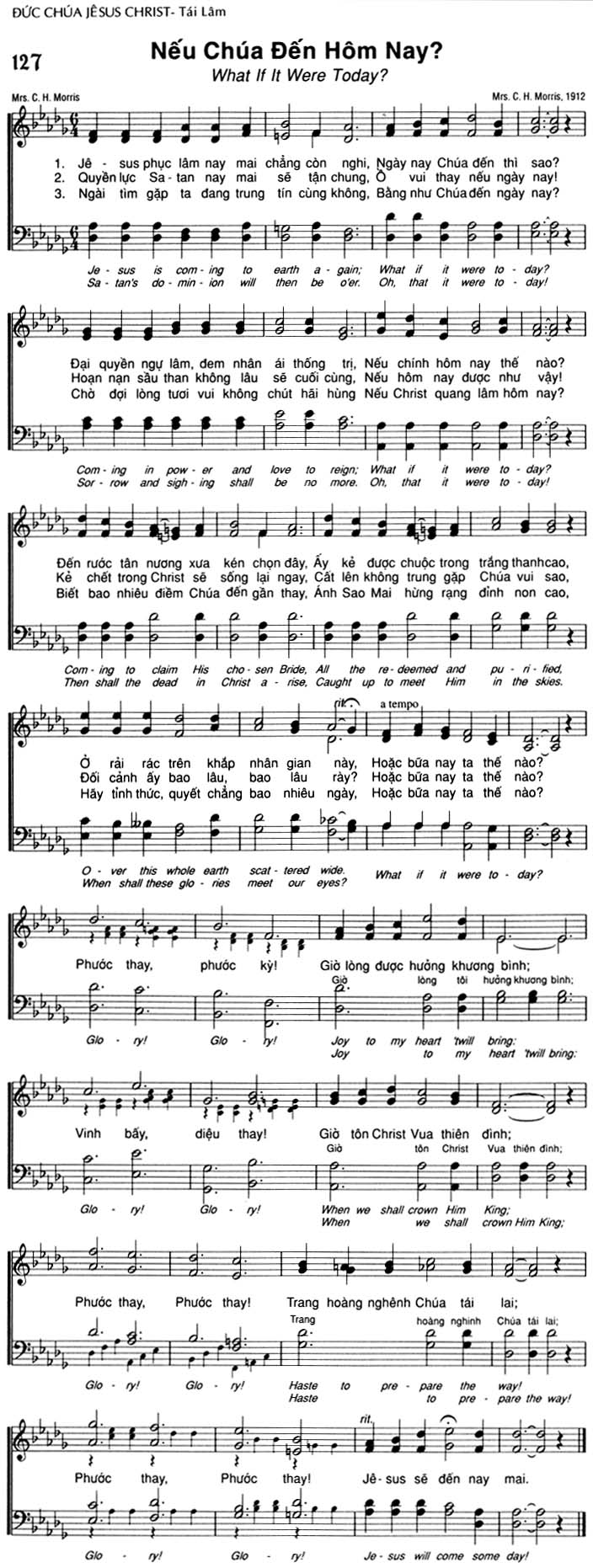 1. Jêsus phục lâm nay mai chẳng còn nghi, Ngày nay Chúa đến thì sao? Đại quyền ngự lâm, đem nhân ái thống trị, Nếu chính hôm nay thế nào? Đến rước tân nương xưa kén chọn đây, Ấy kẻ được chuộc trong trắng thanh cao, Ở rải rác trên khắp nhân gian này, Hoặc bữa nay ta thế nào? 2. Quyền lực Sa-tan nay mai sẽ tận chung, Ô vui thay nếu ngày nay! Hoạn nạn sầu than không lâu sẽ cuối cùng, Nếu hôm nay được như vậy! Kẻ chết trong Christ sẽ sống lại ngay, Cất lên không trung gặp Chúa vui sao, Đối cảnh ấy bao lâu, bao lâu rày? Hoặc bữa nay ta thế nào? 3. Ngài tìm gặp ta đang trung tín cùng không, Bằng như Chúa đến ngày nay? Chờ đợi lòng tươi vui không chút hãi hùng Nếu Christ quang lâm hôm nay? Biết bao nhiêu điềm Chúa đến gần thay, Ánh Sao Mai hừng rạng đình non cao, Hãy tỉnh thức, quyết chẳng bao nhiêu ngày, Hoặc bữa nay ta thế nào? Điệp khúc: Phước thay, phước kỳ! Giờ lòng được hưởng khương bình; Vinh bấy, diệu thay! Giờ tôn Christ Vua thiên đình; Phước thay, Phước thay! Trang hoàng nghênh Chúa tái lai; Phước thay, Phước thay! Jê-sus sẽ đến nay mai.
