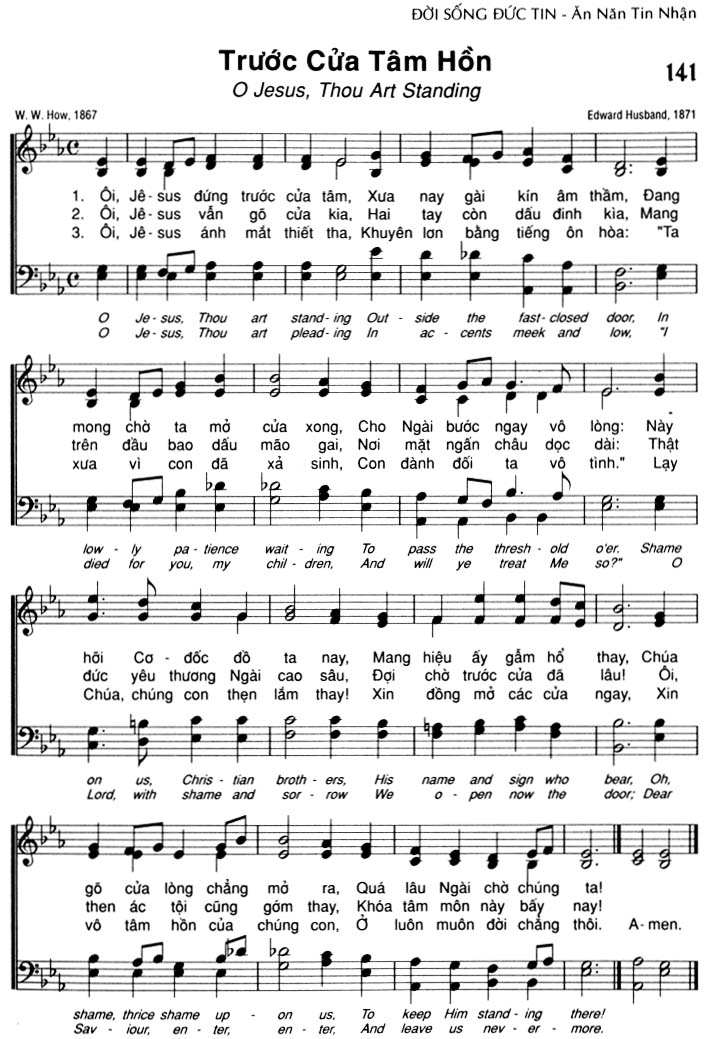 1. Ôi, Jêsus đứng trước cửa tâm, Xưa nay gài kín âm thầm, Đang mong chờ ta mở cửa xong, Cho Ngài bước ngay vô lòng: Này hỡi Cơ-đốc đồ ta nay, Mang hiệu ấy gẫm hổ thay, Chúa gõ cửa lòng chẳng mở ra, Quá lâu Ngài chờ chúng ta! 2. Ôi, Jê-sus vẫn gõ cửa kia, Hai tay còn dấu đinh kia, Mang trên đầu bao dấu mão gai, Nơi mặt ngấn châu dọc dài: Thật đức yêu thương Ngài cao sâu, Đợi chờ trước cửa đã lâu! Ôi, then ác tội cũng gớm thay, Khóa tâm môn này bấy nay! 3. Ôi, Jêsus ánh mắt thiết tha, Khuyên lơn bằng tiếng ôn hòa: "Ta xưa vì con đã xả sinh, Con đành đối ta vô tình." Lạy Chúa, chúng con thẹn lắm thay! Xin đồng mở các cửa ngay, Xin vô tâm hồn của chúng con, Ở luôn muôn đời chẳng thôi. A-men.