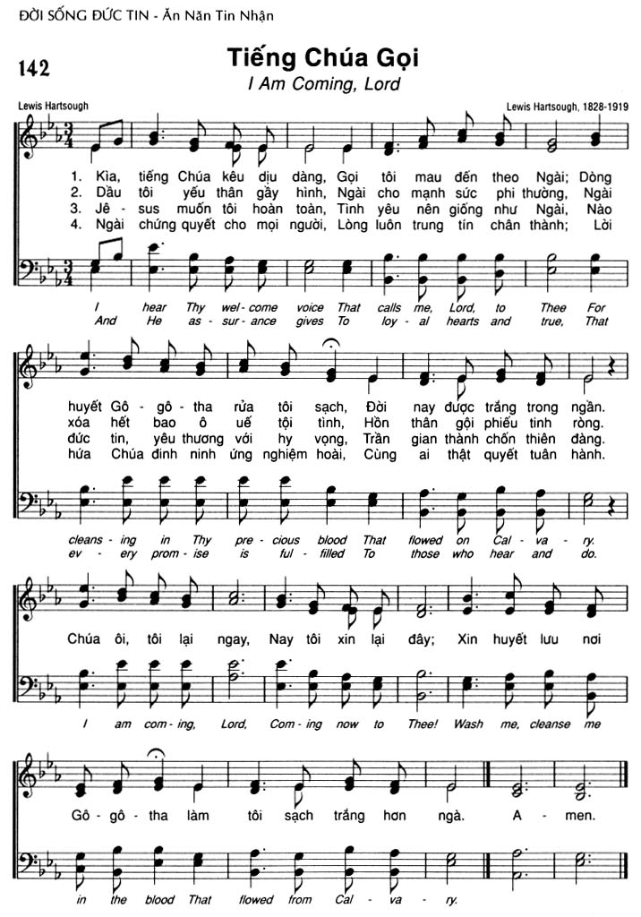 1. Kìa, tiếng Chúa kêu dịu dàng, Gọi tôi mau đến theo Ngài; Dòng huyết Gô-gô-tha rửa tôi sạch, Đời nay được trắng trong ngần. 2. Dầu tôi yếu thân gầy hình, Ngài cho mạnh sức phi thường, Ngài xóa hết bao ô uế tội tình, Hồn thân gội phiếu tinh ròng. 3. Jê-sus muốn tôi hoàn toàn, Tình yêu nên giống như Ngài, Nào đức tin, yêu thương với hy vọng, Trần gian thành chốn thiên đàng. 4. Ngài chứng quyết cho mọi người, Lòng luôn trung tín chân thành; Lời hứa Chúa đinh ninh ứng nghiệm hoài, Cùng ai thật quyết tuân hành. Điệp khúc: Chúa ôi, tôi lại ngay, Nay tôi xin lại đây; Xin huyết lưu nơi Gô-gô-tha làm tôi sạch trắng hơn ngà. A-men.