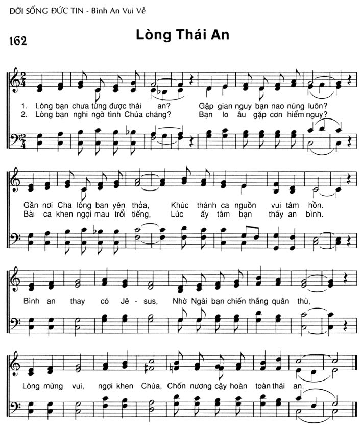 1. Lòng bạn chưa từng được thái an? Gặp gian nguy bạn nao núng luôn? Gần nơi Cha lòng bạn yên thỏa, Khúc thánh ca nguồn vui tâm hồn. Bình an thay có Jê-sus, Nhờ Ngài bạn chiến thắng quân thù, Lòng mừng vui, ngợi khen Chúa, Chốn nương cậy hoàn toàn thái an. 2. Lòng bạn nghi ngờ tình Chúa chăng? Bạn lo âu gặp cơn hiểm nguy? Bài ca khen ngợi mau trổi tiếng, Lúc ấy tâm bạn thấy an bình. Bình an thay có Jê-sus, Nhờ Ngài bạn chiến thắng quân thù, Lòng mừng vui, ngợi khen Chúa, Chốn nương cậy hoàn toàn thái an.