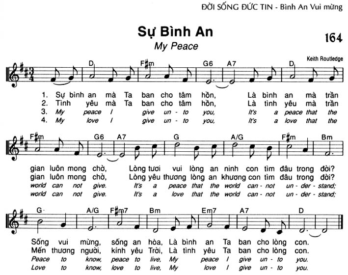 1. Sự bình an mà Ta ban cho tâm hồn, Là bình an mà trần gian luôn mong chờ, Lòng tươi vui lòng an ninh con tìm đâu trong đời? Sống vui mừng, sống an hòa, Là bình an Ta ban cho lòng con. 2. Tình yêu mà Ta ban cho tâm hồn, Là tình yêu mà trần gian luôn mong chờ, Lòng yêu thương lòng an khương con tìm đâu trong đời? Mến thương người, kính yêu Trời, Là tình yêu Ta ban cho lòng con. 3. My peace I give unto you, It's a peace that the world can not give. It's a peace that the world can not understand; Peace to know, peace to live, My peace I give unto you. 4. My love I give unto you, It's a love that the world can not give. It's a love that the world can not understand; Love to know, love to live, My love I give unto you.